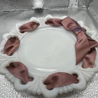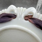 This vintage dessert serving set features a ten-piece collection of milk glass items with a lace edge design. The set includes snack plates, dessert bowls, dessert plates, serving bowls, salad plates, ice cream bowls, side plates, and starter plates, all in a glossy white finish. Made in America, these antique pieces are perfect for all occasions and add a touch of elegance to any table setting. The unmarked brand and vintage production style contribute to the charm and authenticity of this milk glass serving set.