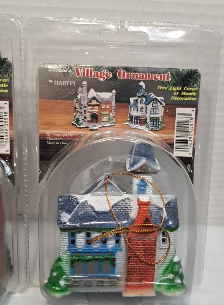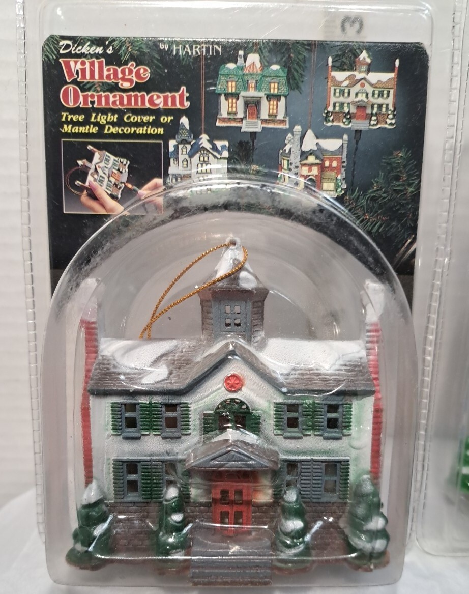 Vintage Tree Light Cover Hartin Dickens Village House Christmas Ornament 4pc set - Included in this set is houses 1 through 4 See photos for measurements These are vintage new House number 1's packaging has a little yellowing and a few cracks/splits but the house is unaffected House number 4's packaging has yellowed and became brittle with age so there is tape on this ones packaging as there is several cracks/splits in the packaging - the house inside the packaging appears to be just fine. Please see photos Please view all photos zooming in on them as they are part of the description for you to judge conditi