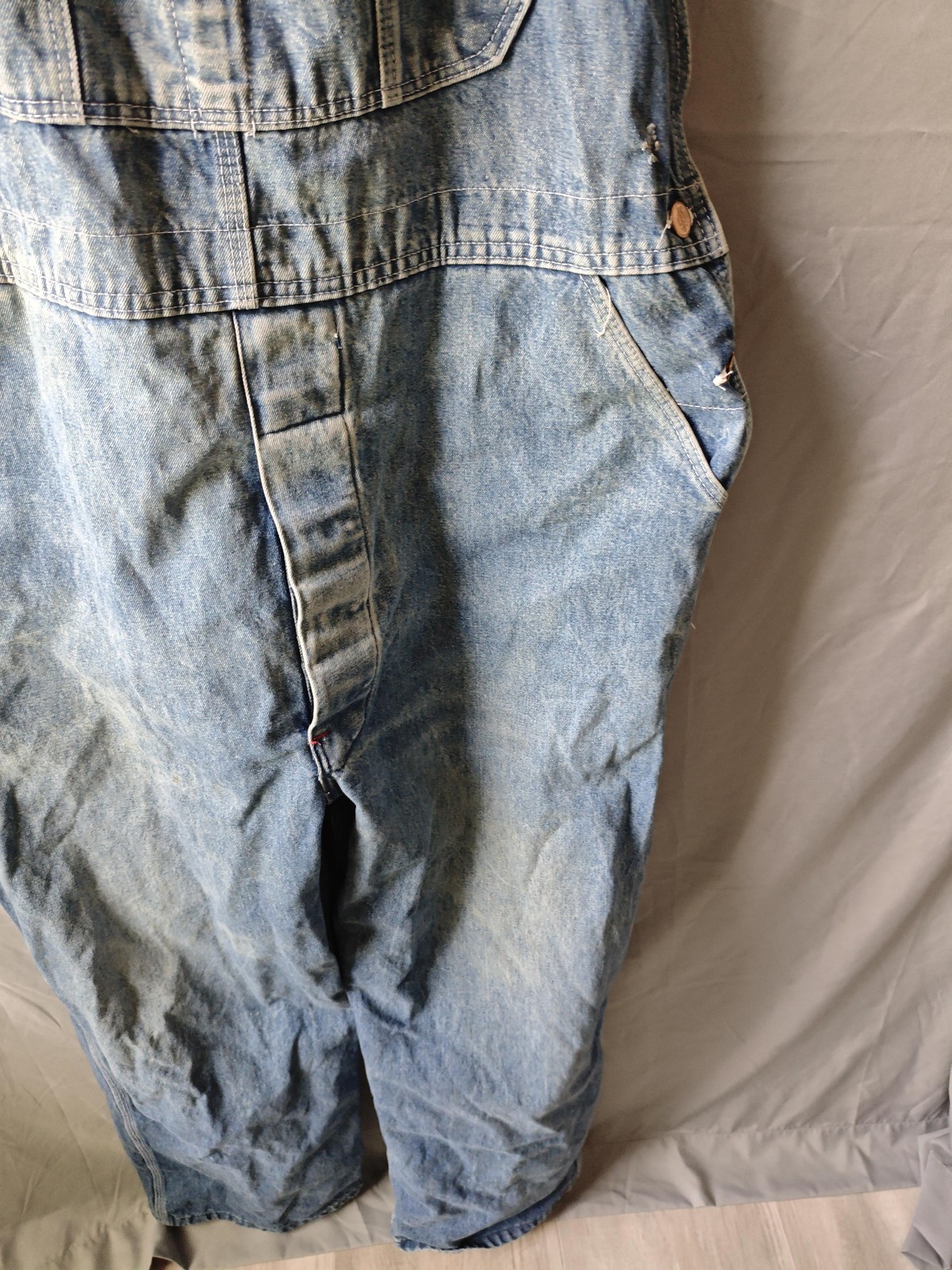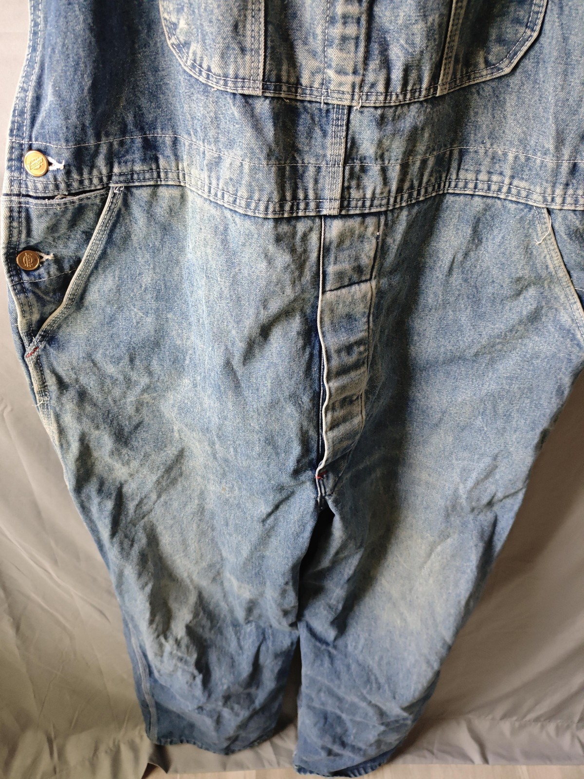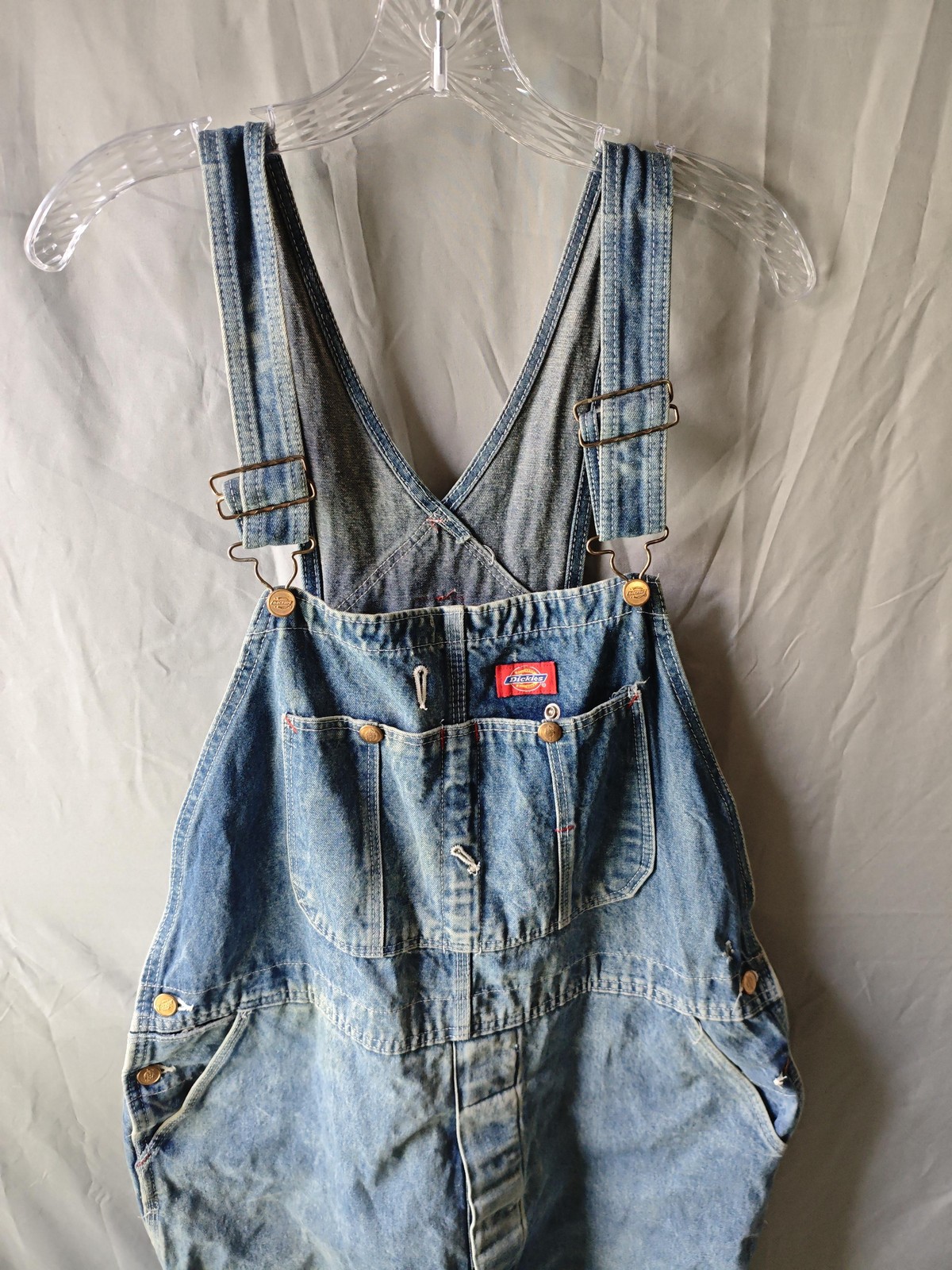 Vintage Dickies Overalls Mens 40x30 Blue Denim Workwear Carpenter Utility Condition: Good vintage condition with moderate wear. Some light fading throughout, small frayed section by left front pocket edge, and a small faint spot on the right leg as shown in photos. No major holes or tears. Classic blue washed denim with heavy-duty construction 100% cotton, made in USA Multiple pockets: front bib pocket, front hand pockets, and back patch pockets Tool loop and hammer pocket on legs for work utility Adjustable shoulder straps Metal Dickies branded buttons and buckles Tag Size: 40x30 (Mens) Approximate measurements in photos for reference Era: 1990s Perfect for workwear, vintage streetwear, or as a collectible USA-made Dickies piece
