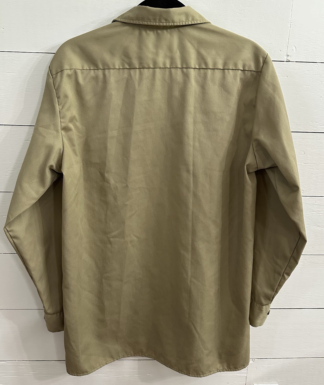 This Vintage Dickies Men's Tan/Khaki Work Shirt in size 2XL is a classic piece of men's clothing perfect for casual, travel, or workwear occasions. Made from a comfortable cotton blend fabric with a solid pattern, long sleeves, button closure, and collared neckline. Featuring a button-down collar style and regular fit, this timeless shirt is suitable for all seasons with its versatile khaki/tan color and is a stylish addition to any wardrobe. Please see pictures for condition and any imperfections.