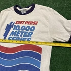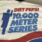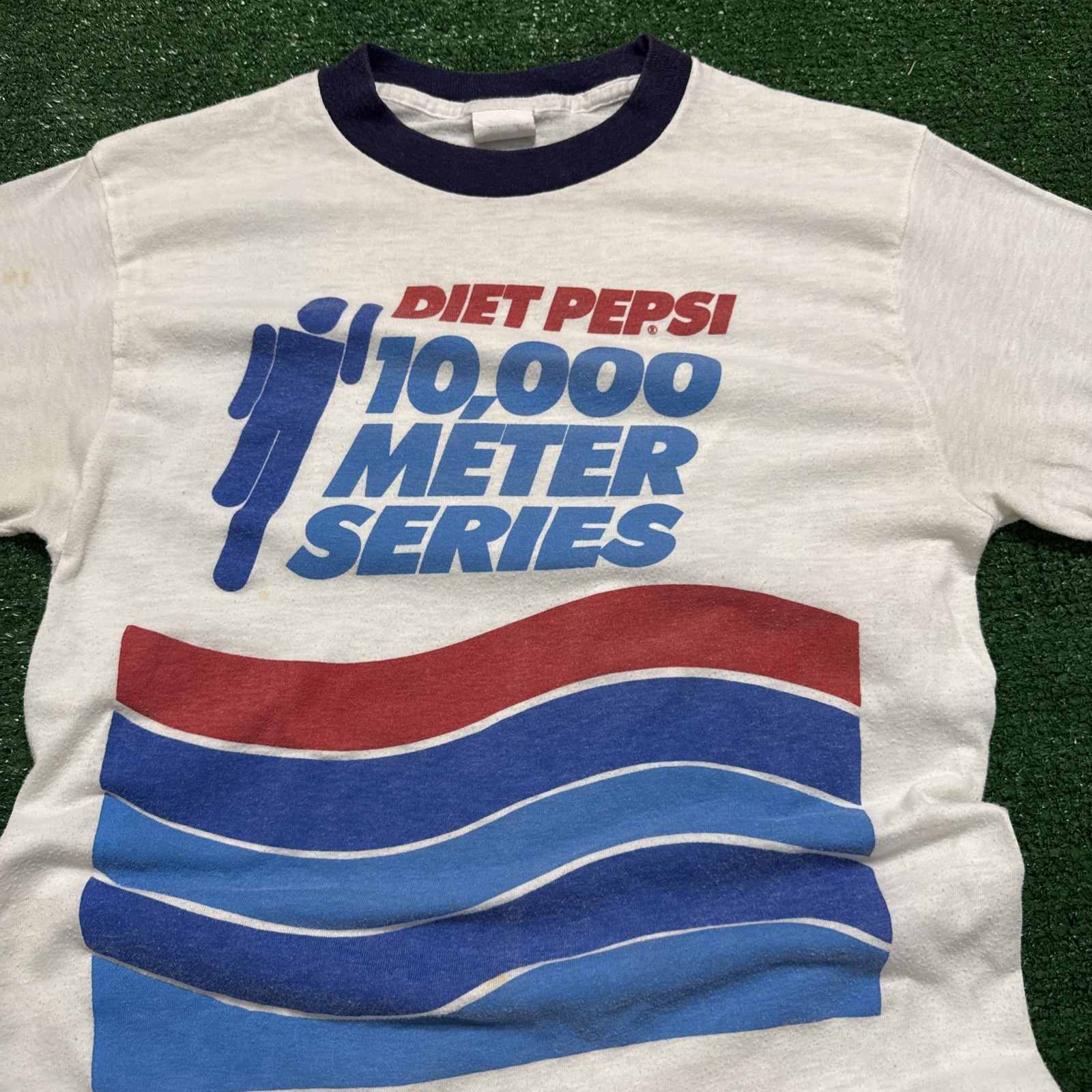 This Vintage Diet Pepsi Cola RUN AMERICA Ringer T-Shirt is a classic piece of soda pop sportswear from the 90s. Made from a poly/cotton blend knit fabric in white, with a solid pattern and short sleeves, this tee features a crew neck and a regular fit for comfortable wear. The shirt is machine washable and showcases a vintage vibe with single-stitched detailing, making it a unique and nostalgic addition to any wardrobe for fans of retro soda pop culture.