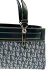 Christian Dior Womens Trotter Jean Pocket Tote Bag Monogram Pattern BM-0032 CHRISTIAN DIOR Jeans Pocket Tote - Silver hardware - Two flat top handles - Blue Trotter canvas with belt loop and denim pocket details. Pre-owned Christian Dior Trotter tote bag featuring monogram textile exterior, blue leather trims, dual flat leather top handles, adjustable strap with silver-tone buckle at front, decorative pocket slits, open top. Textile lined interior featuring central zipped compartment and one zipped pocket. Designed by John Galliano in 2002. This bag is in near perfect shape. Doesn't look like it was every carried. No dust bag included. Features: • Bag Size: Womens 7.5" x 14" Condition: Pre-Owned Like New