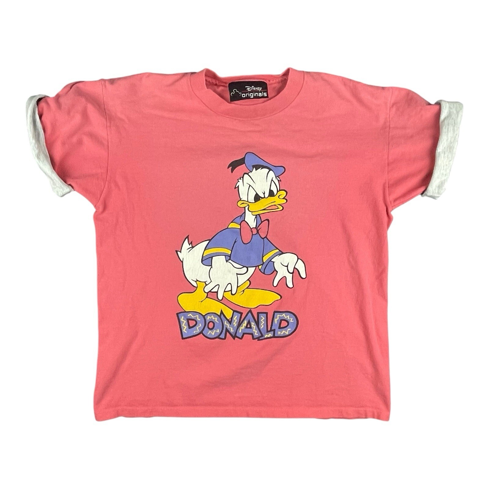 Vintage Made In USA Donald Duck Disney Pink T-Shirt Size S/M. Shirt has been gently loved. There is s small blemish on the bottom left of shirt which is shown in the last photo. Shirt is made in USA. There are no holes on shirt. Shirt is size small/medium.