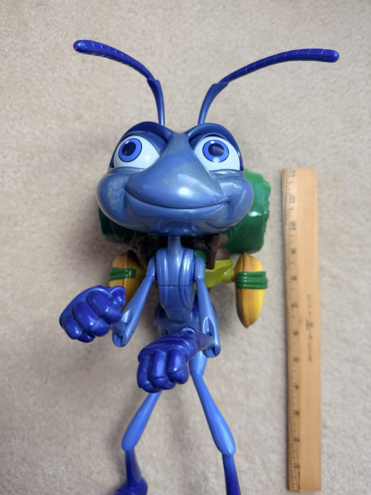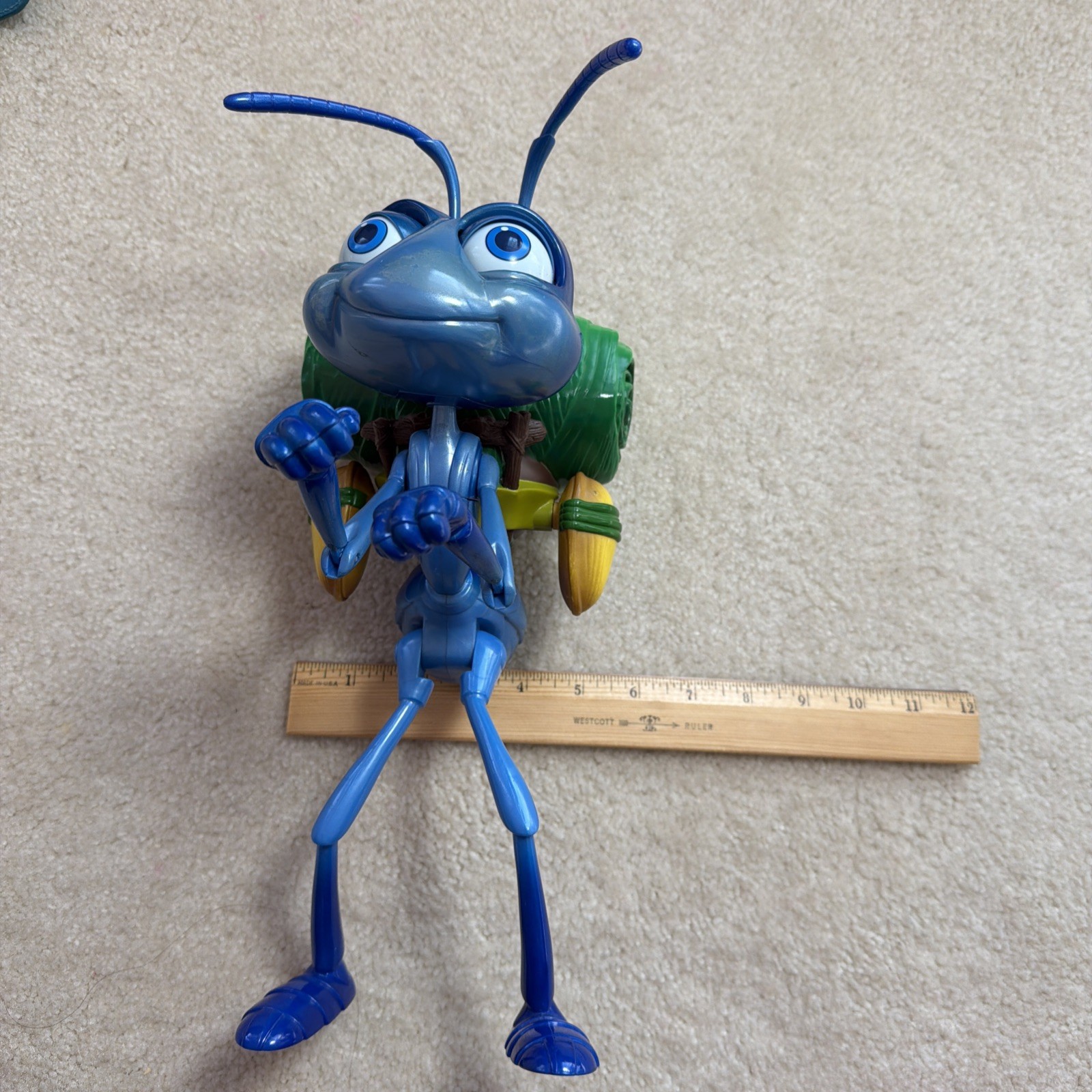 Relive the magic of Pixar’s early days with this vintage Flik Talking Action Figure! Originally released by Mattel in 1998 for the debut of A Bug's Life, this large-scale figure stands approximately 13 inches tall (to the top of his antennae). Key Features: • Interactive Character: This is the "Deluxe Talking" version. When functioning, Flik’s head moves, his eyes blink, and his antennae swing as he speaks phrases from the movie. • Authentic Detail: Features Flik in his "Traveling" gear with his signature leaf-and-acorn backpack. • Highly Collectible: A must-have for Disney/Pixar collectors, capturing the whimsical design of the film's inventive hero. Condition Notes: • Body: Pre-owned vintage condition. There is some minor surface wear/scuffing on the face (specifically the left cheek) as shown in the photos. • Electronics: tested and working • Batteries: Requires 4 AA batteries (not included). This unisex toy is a perfect addition to any Pixar collection or a nostalgic gift for fans of the heartwarming story of the ant who dared to be different.