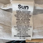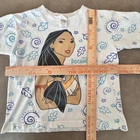 Brand: Sun Sportswear for Disney. Item: Vintage girls Disney Pocahontas short sleeve graphic shirt with classic crew neckline and regular fit. Size: Tagged Medium 10/12 girls. Color/Pattern: Off-white base with multicolor teal, purple, and blue allover swirls, leaves, and stars with large Disney Pocahontas artwork and logo on both front and back. Material: 100% cotton knit fabric for a soft, breathable feel. Features: Double-sided Pocahontas print with identical design on front and back, ribbed crew neck, short sleeves, and straight hem. Tag details: Inner labels read Sun Sportswear Kent, WA with care tag noting 100% cotton, RN 72100, Made in U.S.A., Medium/Mediana 10/12 with bilingual washing instructions. Era: Original 1990s Disney Pocahontas licensed merchandise produced in the USA, ideal for Disney Princess fans and vintage cartoon collectors.