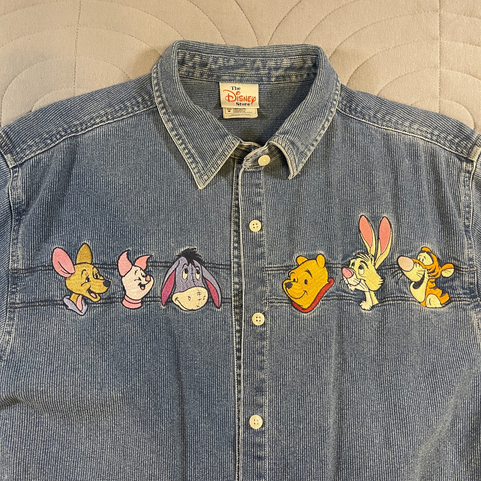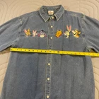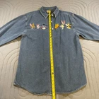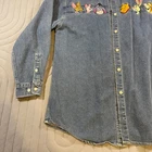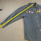 This Vintage Disney Winnie The Pooh shirt for women in size medium is a classic blue corduroy button-up featuring beloved characters. The shirt is collared, has long sleeves, and is machine washable for easy care. With embroidered accents and a solid pattern, this vintage Disney shirt is perfect for casual occasions during the winter, fall, or spring seasons. Made from cotton and branded as Disney, this shirt is a charming addition to any wardrobe, especially for fans of cartoons and retro fashion.