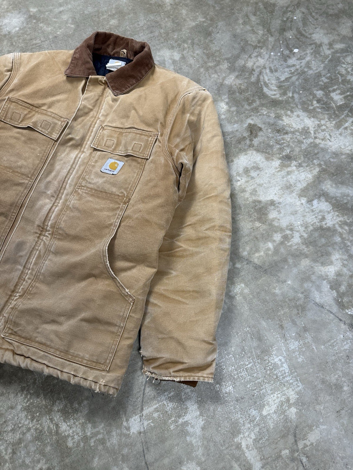 The fade on this jacket is perfect. Distressed as well on sleeves Measurements in photos