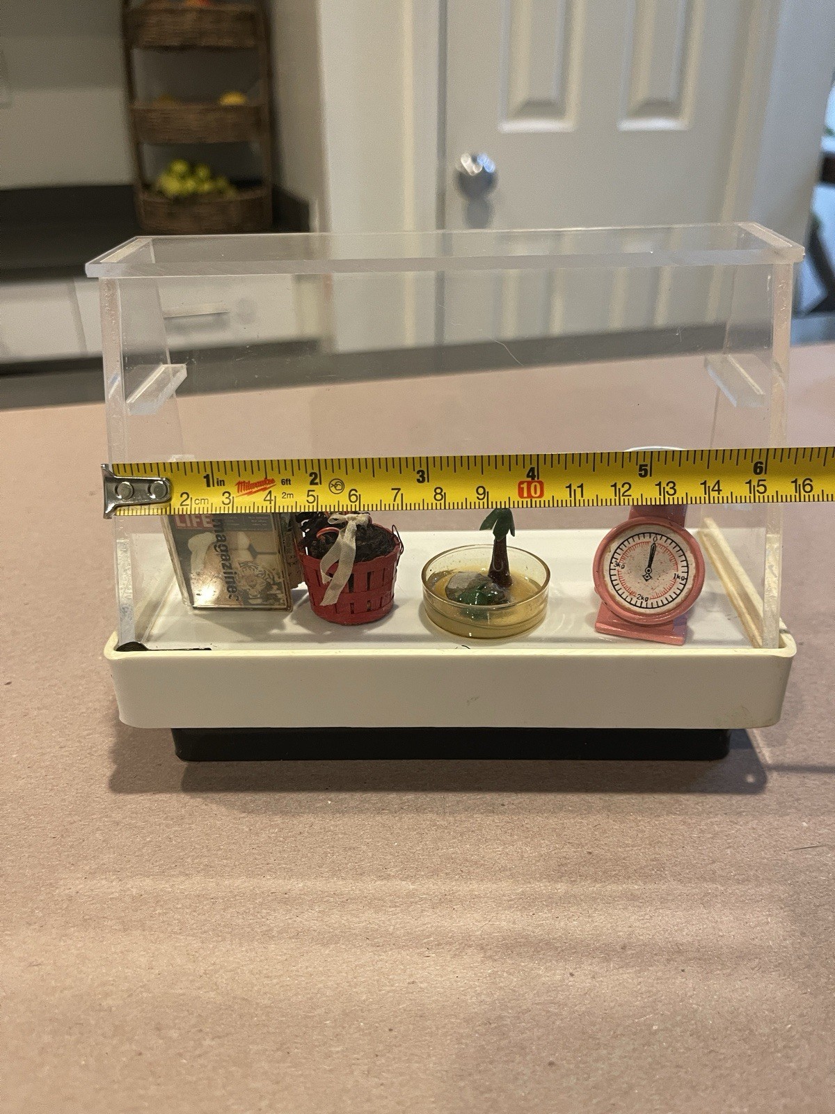 This vintage dollhouse miniature counter comes with four accessories and is artist made, adding charm and character to any dollhouse collection. The multicolor pieces are crafted from a mix of wood, plastic, and metal, in a 1:12 scale. This unique counter adds a touch of nostalgia and craftsmanship to your dollhouse display. It includes: scale made out of metal(heavy), little aquarium with a turtle, stuck of newspapers and a Christmas basket. Very unique and collectible, and you won’t find anything similar anywhere. Need more information please send me a message.