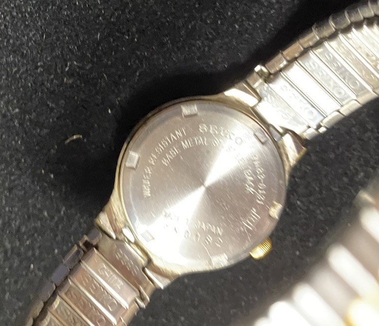 The Vintage ESQ Swiss Watch for women features a classic round design with a silver tone case and bracelet, complemented by a blue dial with Arabic numeral and baton indexes. This stylish timepiece has a quartz movement and is water-resistant, making it perfect for everyday wear. The watch also includes a date indicator and has a 12-hour dial, adding practicality to its elegant design. With a vintage touch and new battery, this ESQ Movado watch is a timeless and versatile accessory for any occasion. Battery replaced 12/8/2025 by jeweler. Does not include watch box.