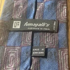 This product is a vintage EUC Fumagalli silk geometric tie, designed for men and made in Spain. The multicolor tie features a preppy style with a classic width and is crafted from 100% silk jacquard fabric. With its geometric pattern and designer brand, this necktie offers a touch of sophistication and retro charm to any formal or professional outfit.