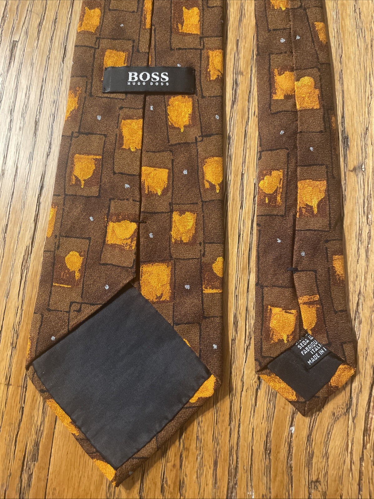 This vintage Hugo Boss geometric silk tie is a classic accessory for men, featuring a sophisticated design made in Italy. The multicolor geometric pattern adds a touch of designer style to any outfit, with a luxurious feel from the 100% satin silk material. Perfect for adding a timeless touch to a formal or professional look, this necktie exudes elegance and quality craftsmanship from a renowned brand like Hugo Boss.