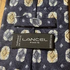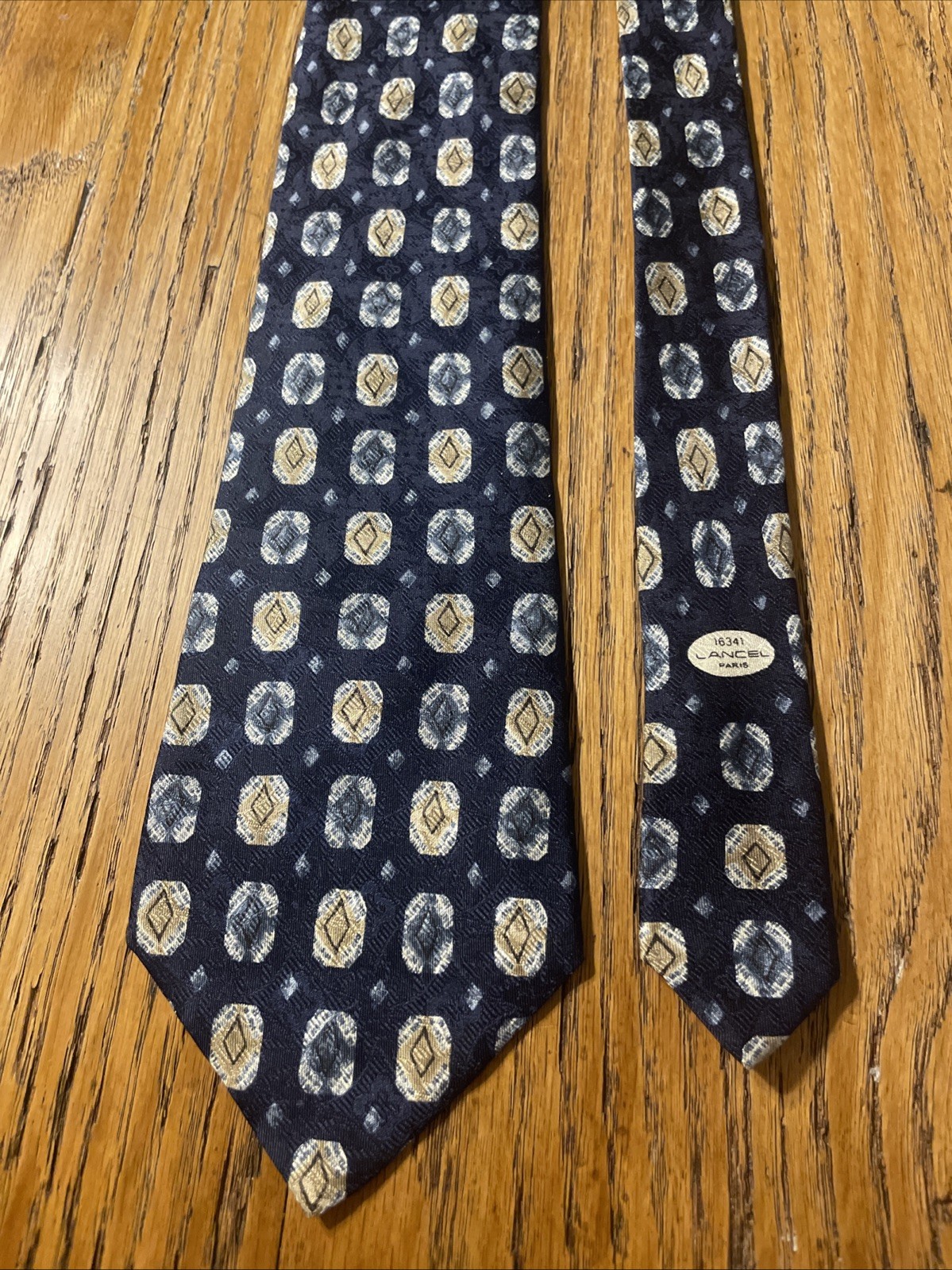 This product is a vintage handcrafted Lancel Paris silk geometric tie, designed in Italy. The tie features a classic width and is made of 100% silk satin in a multicolor geometric pattern. It exudes a preppy style, perfect for adding a touch of sophistication to any men's outfit. Made with quality and attention to detail, this designer piece is a timeless addition to any wardrobe.