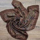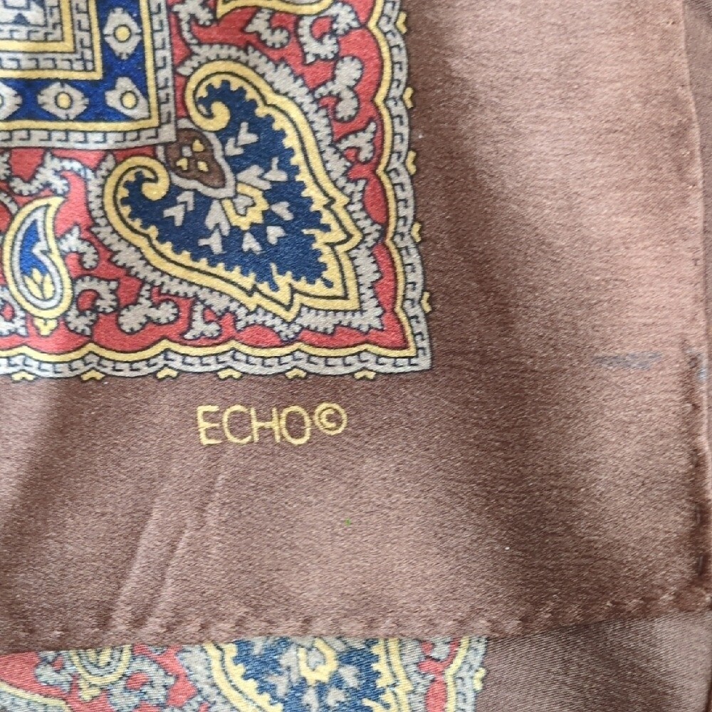 Vintage Echo brand 100% silk scarf. Features a geometric paisley pattern in colors of brown, blue, red, gold, and black. Size 31.5" x 31.5" Condition: Great condition. No holes of stains.