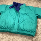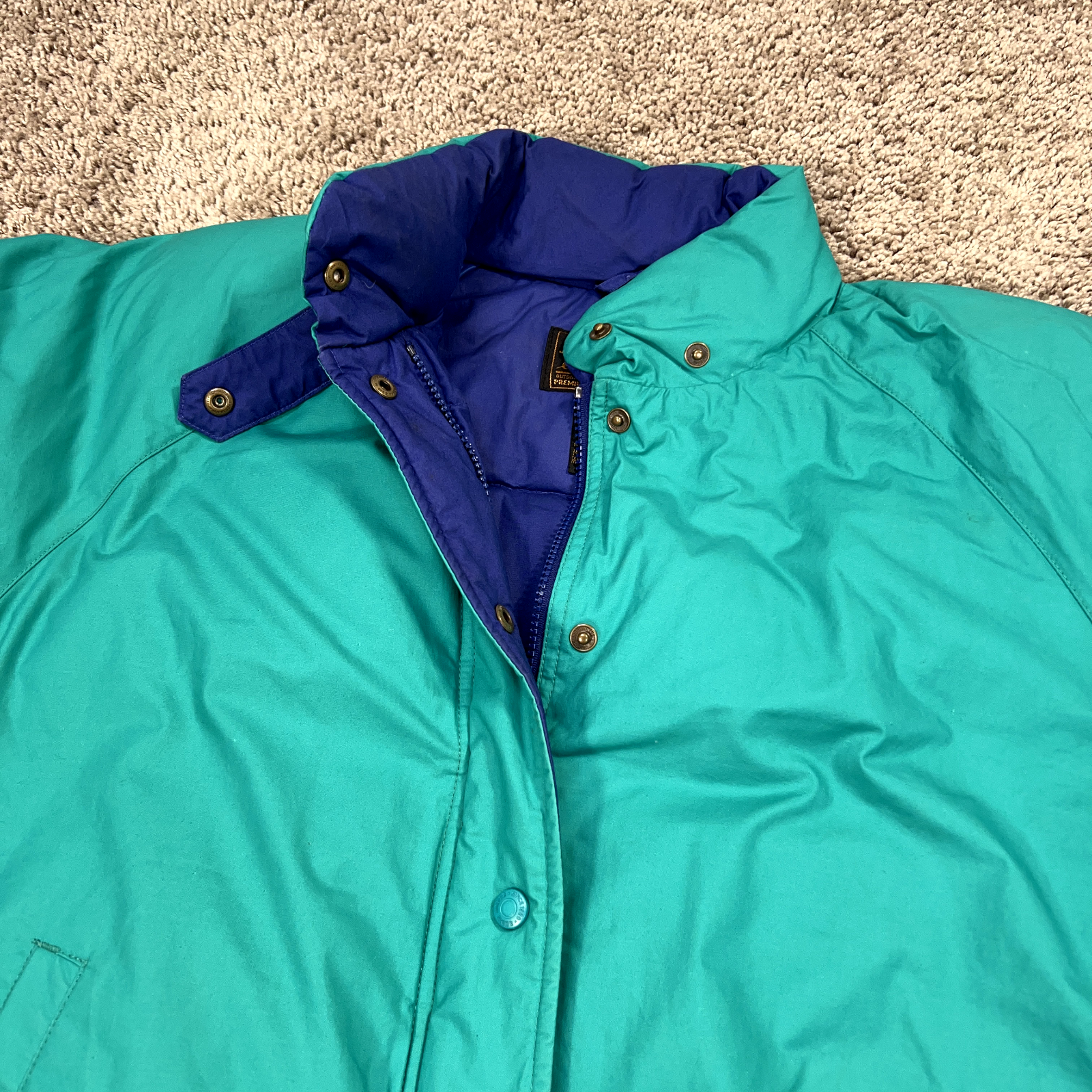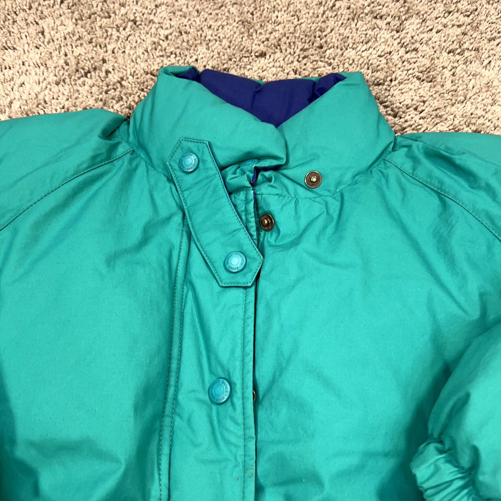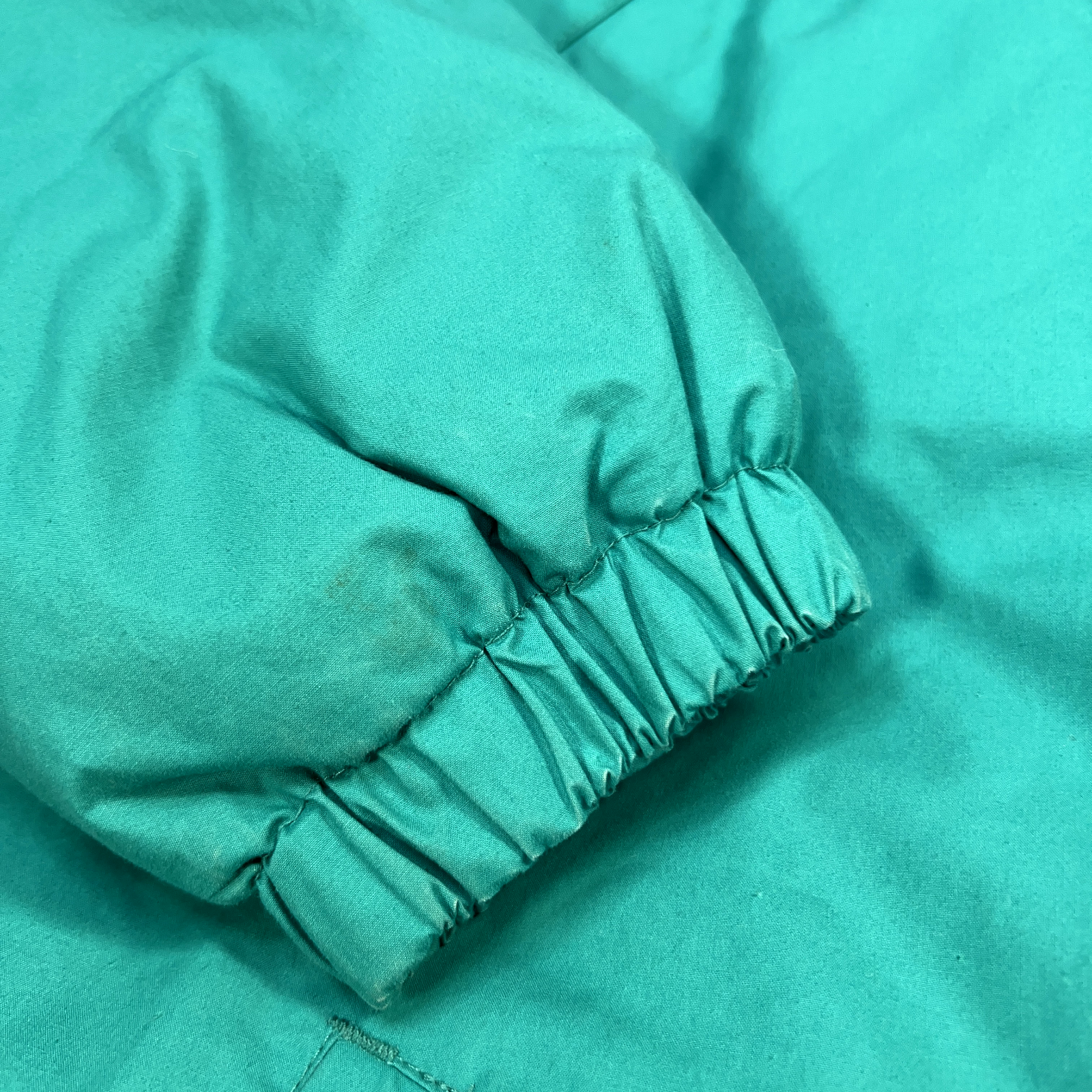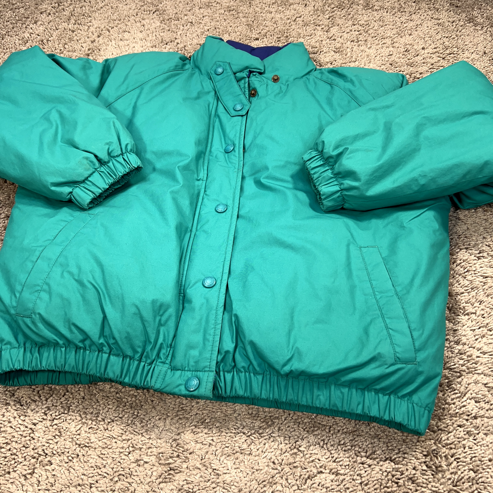 This vintage Eddie Bauer puffer jacket is a fantastic find! The green color is classic, and the goose down keeps you super warm. The purple lining adds a fun pop, and it’s in great condition—just a light spot on the cuff. Fits like a true men’s small, so check the measurements if you’re unsure. Perfect for winter adventures!