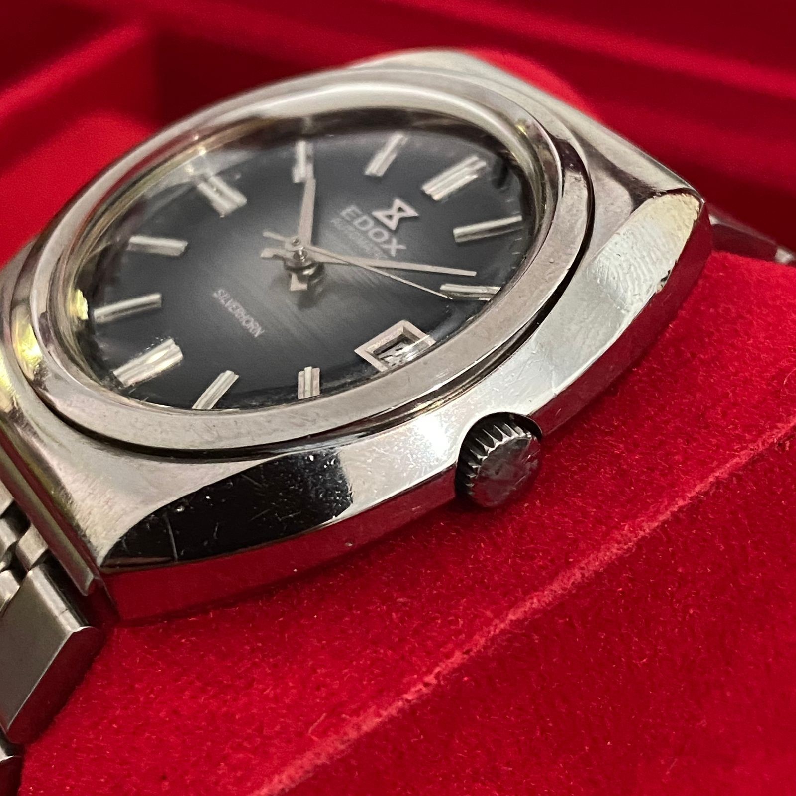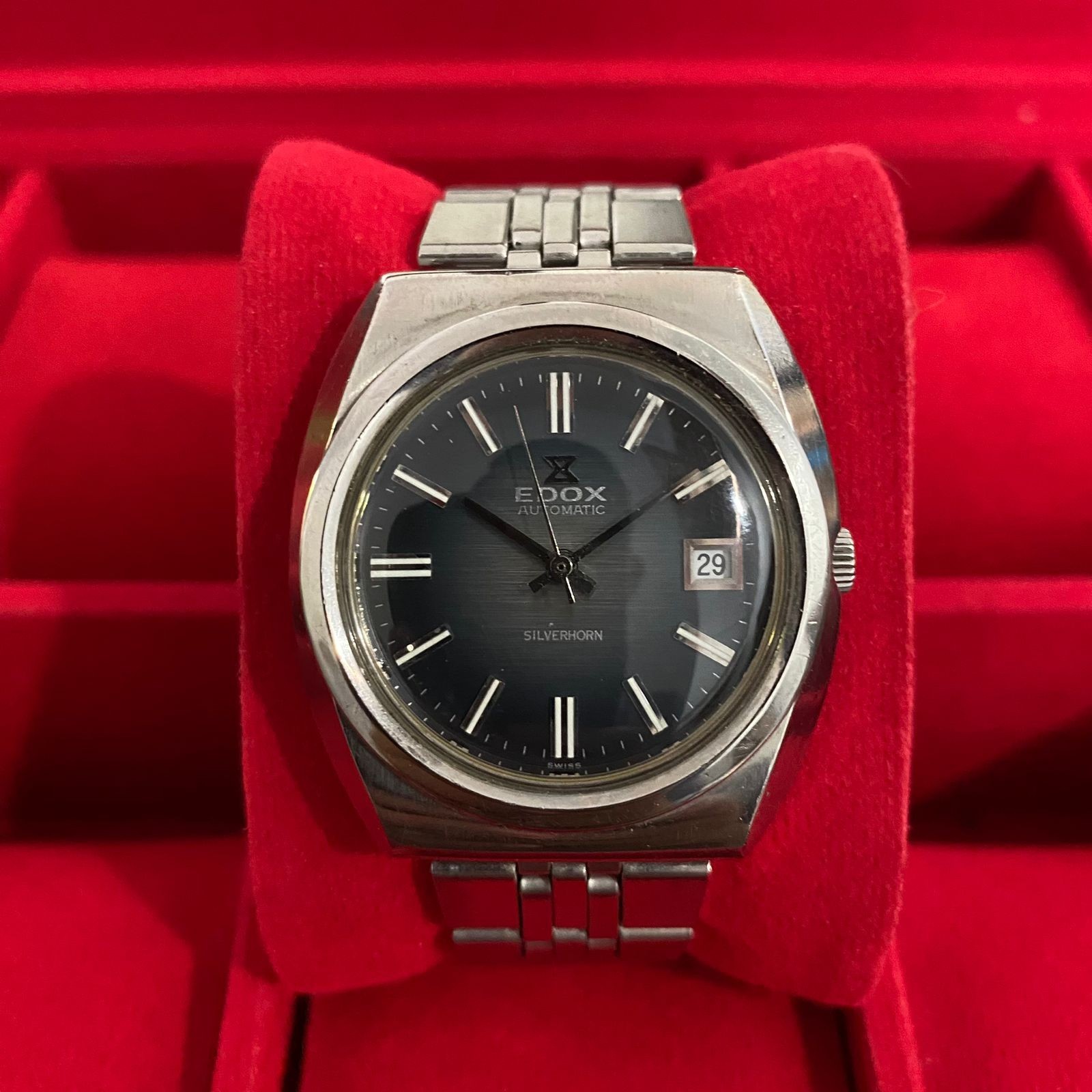 Rare Edox Silverhorn Automatic ETA Date Blue Dial Vintage Watch Edox Silverhorn Automatic Movement Blue Dial Diameter 38mm Include Crown Bracelet AM Watch Only with Replace Box Shipping , Returns and Sales Terms,: ------------------------------------------- We ship worldwide via Fedex or DHL Express We not accept Return We do combine shipping we not responsibility for Import duties, taxes, and charges , so please check in your country's customs office to determine what these additional costs will be prior to bidding or buying. Please check the item condition and photos carefully before buy or make your bid and Please don't buy/bid if you don't have any intention to buy. Once you make your buy/bid, it means that you are willing to buy it and also willing to pay for the final value and shipping cost. Any condition that is not describe on item's description but shown in photos will be considered as described. Sold As Photo, no return accepted. If you bid and win the auction means that you already understand and accept the item condition as describe above.