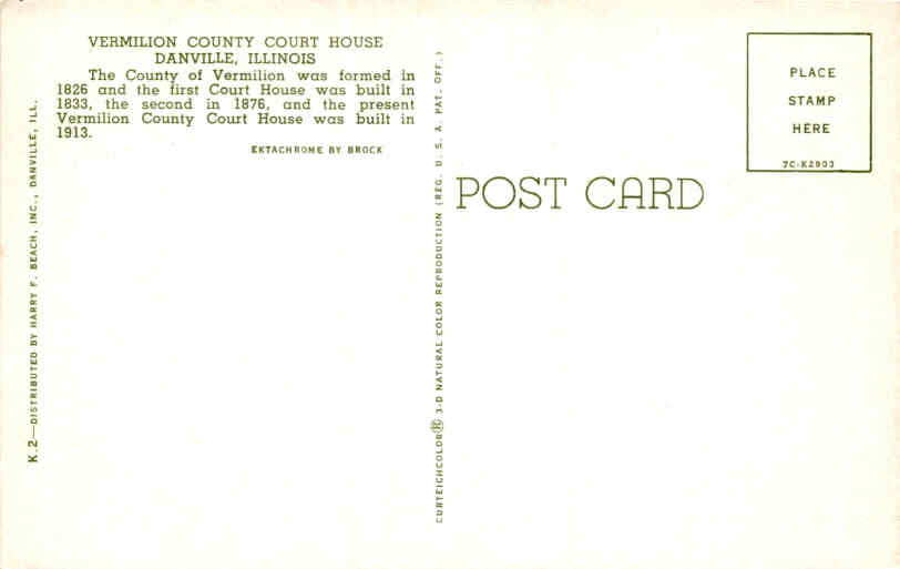 MAKE AN OFFER. THE MORE YOU BUY THE BETTER DEAL I WILL ACCEPT The postcard features an image of the Vermilion County Court House in Danville, Illinois. The county was established in 1826, and the first court house was constructed in 1833, followed by a second one in 1876. The current Vermilion County Court House, depicted in the image, was built in 1913.