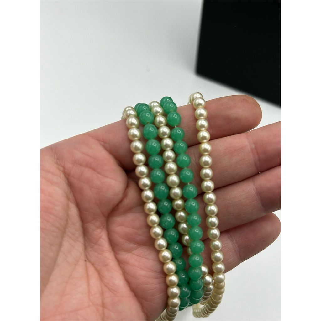 This layered green necklace exudes elegance and sophistication, making it a perfect accessory for any occasion, from a formal gala to a casual brunch with friends. The faux pearl and bead design adds a touch of timeless charm, while the hook closure ensures a secure fit. Its vibrant green hue captures attention and complements a variety of outfits, adding a splash of color to your ensemble. This pre-owned piece offers a unique blend of style and grace, ready to enhance your jewelry collection. Keywords: layered necklace, green necklace, elegant jewelry, sophisticated style, faux pearl, bead necklace, hook closure, formal accessory, casual accessory, pre-owned jewelry, green beads, timeless charm, vibrant hue, unique style, jewelry collection. Style: Layered Brand: Unbranded Type: Necklace Color: Green Theme: Elegant, Sophistication Main stone color: Green Material: Faux Pearl, Beads Features: Layered Closure: Hook As most vintage jewelry, there could be minor discoloration, or light scratches or scuffs. Please look at photos for condition or contact me with any questions or measurements.