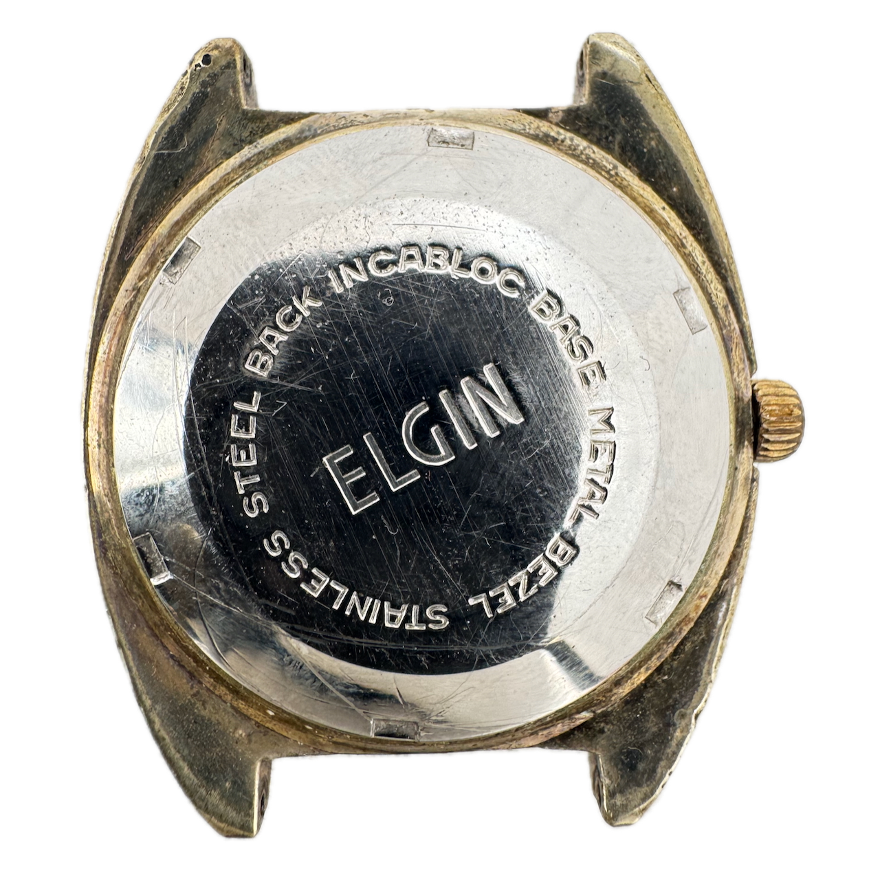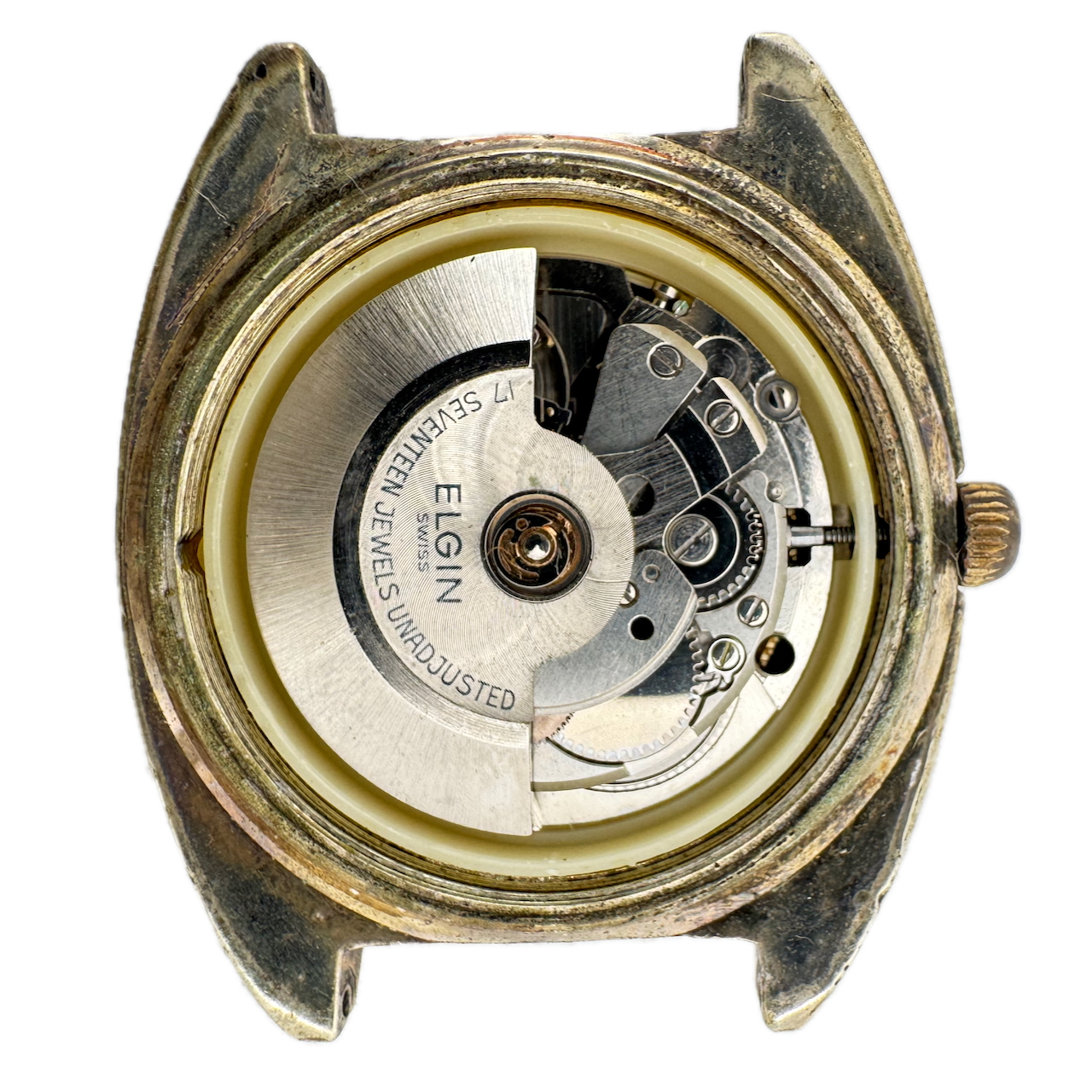 Vintage 37mm Elgin 909 6090 Day Date Men's Automatic Wristwatch 909 Running Product Description Item: Wristwatch Brand: Elgin Model: Day Date Reference: 909 6090 Movement: Automatic Case Material: Two Tone Country: Swiss Jewels: 17 Jewel Gender: Men's Caliber: 909 Size: 37mm Product Measurements Diameter: 37mm Lug Width: 18mm Lug to Lug: 42mm Thickness: 13.5 mm Product Condition Overall Condition: Fair, overall condition for its age. Functions: Running, but may be in need of service. This means, it can run unreliably, start or stop and timekeeping is not guaranteed. Fast 62 Seconds a Day, Amplitue 226, Beat Error 0.2 Case: There is discoloration on the case. Crystal: There are scratches on the crystal. Dial: The dial is in rough condition. Hands: The lume has faded. About the brand: First founded in 1864 as the National Watch Company, Elgin watches were produced out of Elgin, Illinois at the world's largest dedicated watch production facility of the time. By 1910 - Elgin had built an observatory to help with the accuracy of their timepieces. Like most watch manufacturers, Elgin moved to defense production during the second World War and produced military issue watches such as the well known Elgin A-11. After the war, production of Elgin watches slowed and they transferred production to South Carolina. As the influx of Swiss watches came into the market, the Elgin brand sold its entities in 1968, and the name rights of the company were subsequently re-sold in the following years. Although the Elgin National Watch Company no longer exists, their impact on American watch making is seen through their large catalog of excellent vintage watches.