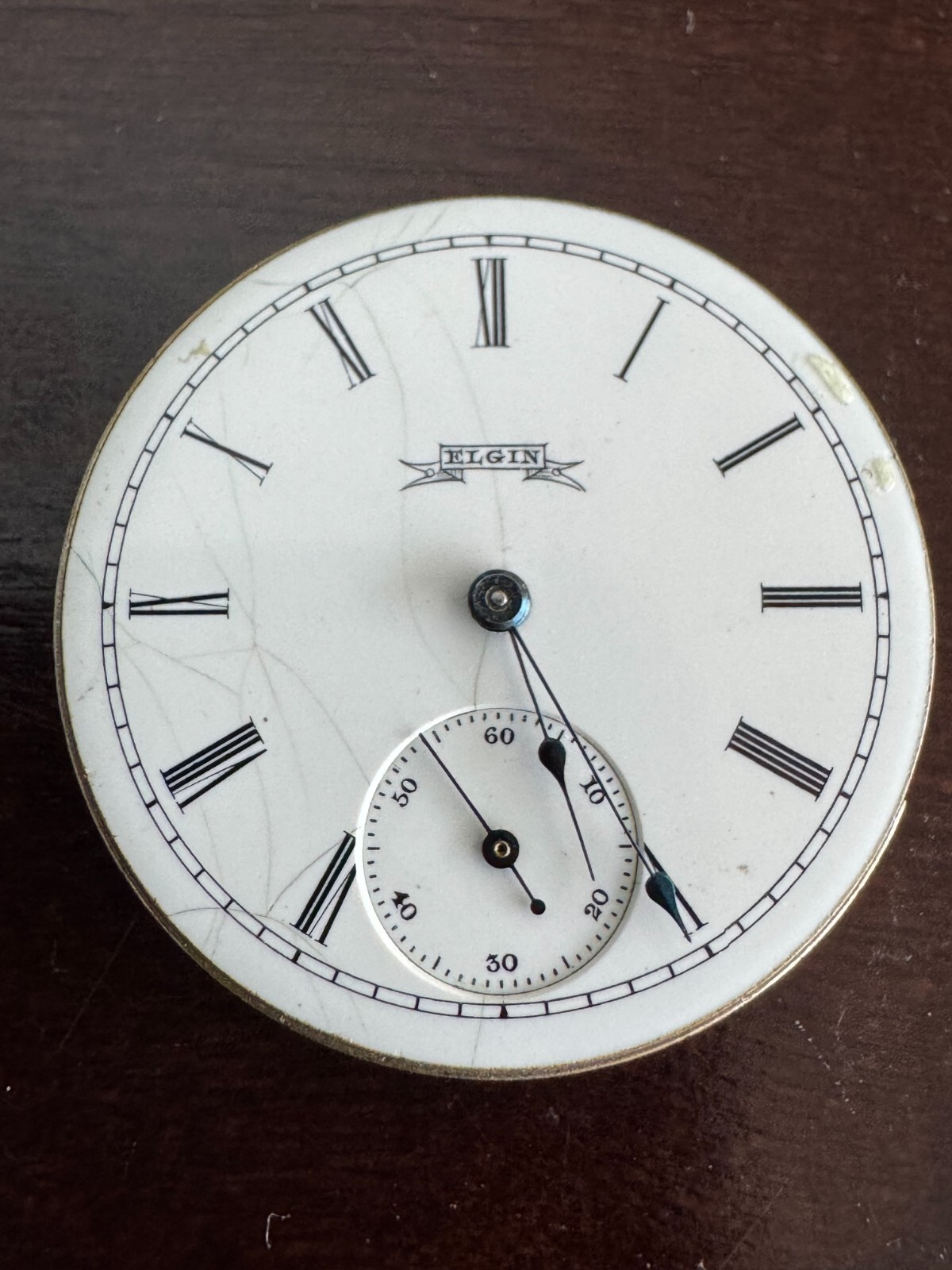 VINTAGE 6 SIZE ELGIN POCKET WATCH MOVEMENT GR. 216 KEEPING TIME DIAL IS HAS MULTIPLE HAIRLINES Elgin National Watch Co. Grade: 216 Manufacturer: Elgin Manufacturer Location: Elgin, Illinois Movement Serial Number: 8293517 Grade: 216 Model: 2 Class: 75 Estimated Production Year: 1900 Run Quantity: 4,000 Grade/Model Run: 1 of 45 Grade/Model Total Production: 101,540 Size: 6s Jewels: 15j Jewel Setting: Screw-Set Movement Configuration: Hunting Movement Finish: Nickel Movement Setting: Pendant Wind Mechanism: Pendant Plate: 3/4 Plate Barrel: Going Train: Quick Regulator: Plain Hairspring: Breguet Escapement Type: Straight-line Standard Dial Type: Single-Sunk Adjusted: No Railroad Grade: No U.S. Patents: 77078 Case: Various Run ID: 3348.216G1.6S474.62M263.H2393.P1436.15J941 Data Research: 1904 Elgin Serial List 1915 Elgin Serial List 1927/1950 Elgin Serial List Database Version: v52.642