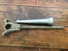 This auction is for a vintage Elkhorn Fire Hydrant Wrench. Model number S-454. It is adjustable as the handle screws in and out. According to info found on the manufacturer website, it has a Magnanese Bronze head. In addition a vintage Elkhart Brass Mfg Co large fire hose nozzle is included. It measures 10 inches long. See photos for more details. Shipping quoted is for the continental US.