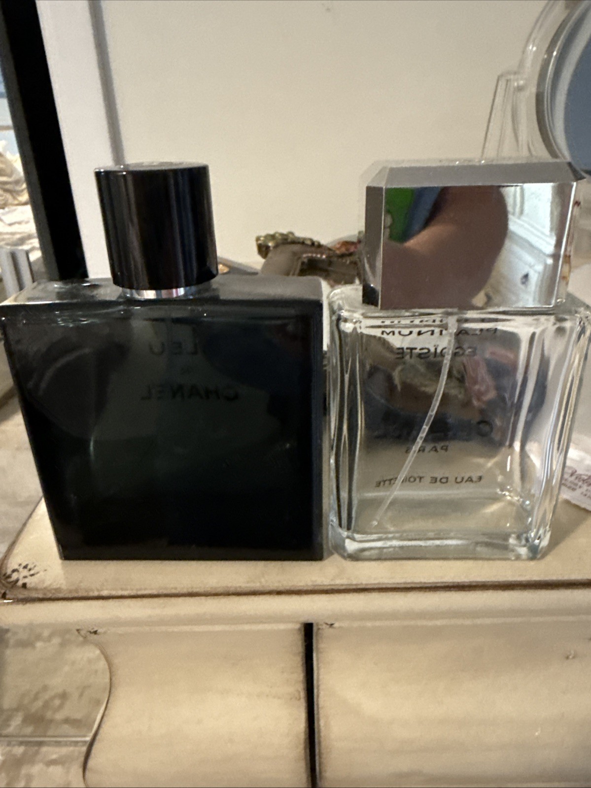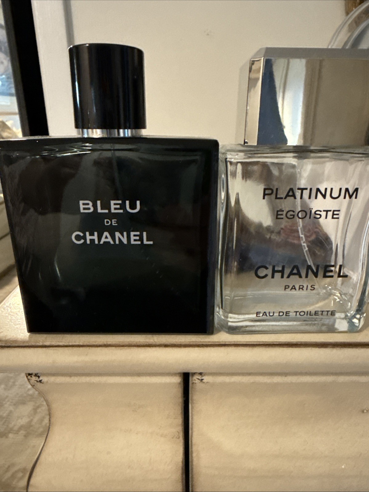 Two empty men’s Chanel bottles, Bleu De Chanel and platinum Egoiste Chanel Paris