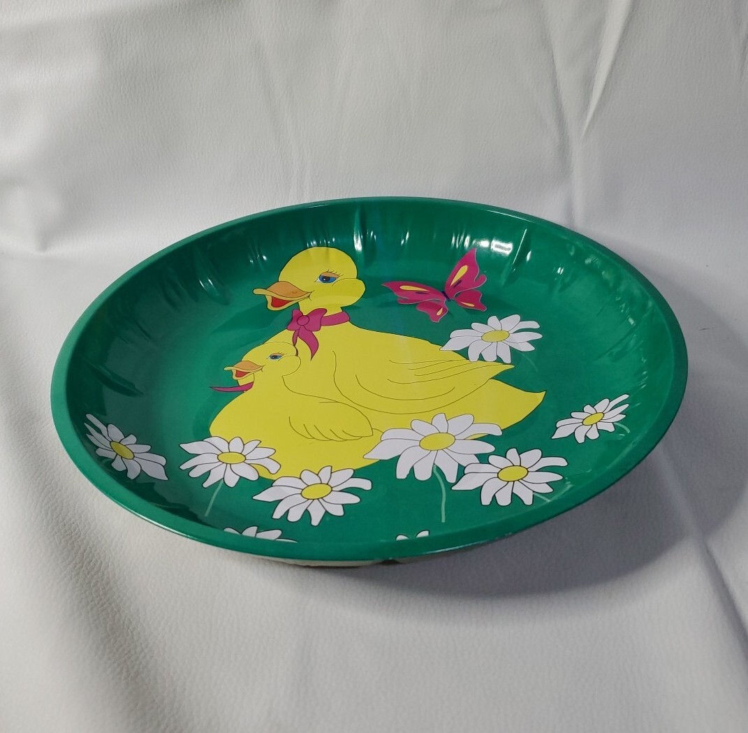 This vintage Enesco metal tray is a charming addition to any Easter collection. The tray features adorable ducks, a butterfly, and flowers in a cheerful green color. It was manufactured in China during the 1990s and is in excellent used condition (EUC). Perfect for displaying or serving Easter treats, this tray is made of durable metal and has a size of 10 inches. It is sure to delight collectors and fans of Easter-themed decor alike. Add this Enesco tray to your collection today!
