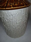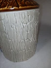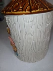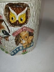 The Vintage Enesco Woodland Commune Cookie Jar is a charming piece from 1977 featuring a whimsical design with a raccoon, owl, and squirrel. This medium-sized ceramic and porcelain cookie jar has a single compartment and a colorful multicolor finish. Complete with a lid, this original Enesco Sweet Shoppe model adds a touch of vintage retro style to any kitchen decor. Made in Japan, this collectible piece is a nostalgic addition to any kitchen storage and organization collection. hairline crack on top of lid. hard to see. photo closeup some hairline cracks on inside lid lis is still very solid small chip at bottom of jar at bottom of blue ladder several small chips on characters, racoons noses, cheeks and red awnings - where white is light wear please see photos