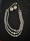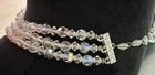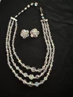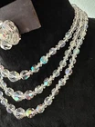 Stunning 1950s clear Aurora Borealis crystal 3 strand necklace and clip earrings set. The top necklace measures approximately 16” long with a 2-3 inch drop while the earrings are about 1” in diameter. See photos for measurements. Photos are accurate depiction of condition. If you have any questions, please ask. Thanks for looking!! Ships with USPS Ground Advantage. I do combine shipping on items purchased and/or won at auction at the same time. May not be possible with large or odd shaped items or glass. Please message me before paying. Thank you.