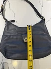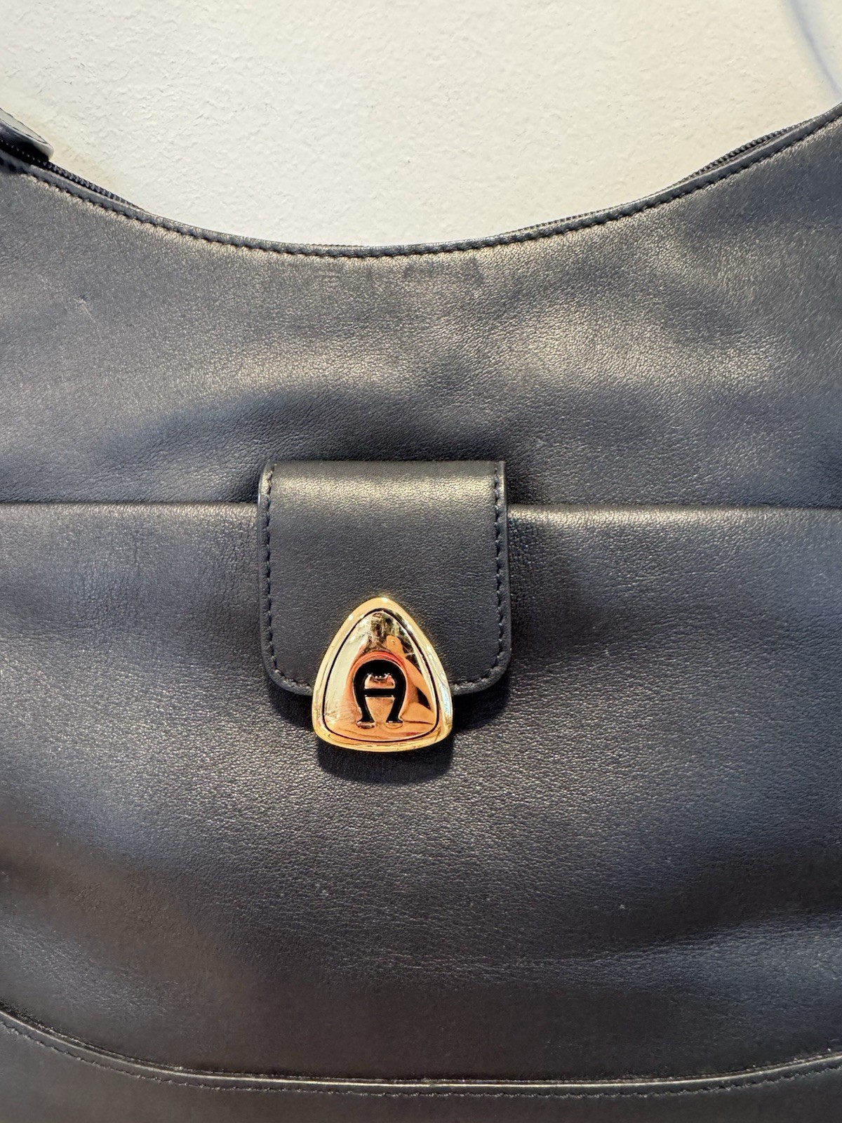 This Vintage Etienne Aigner Leather Handbag Purse is a classic black shoulder bag with gold hardware, featuring a solid rectangular shape and a zip closure. Made from leather, it has a medium size with a shoulder strap handle style. The interior includes inner pockets, a black lining, and a charming bag charm. Perfect for women looking for a timeless and stylish accessory to complement their outfit, this Etienne Aigner handbag exudes sophistication and elegance.