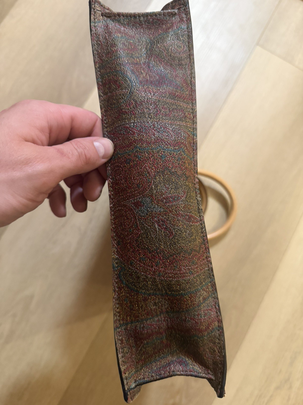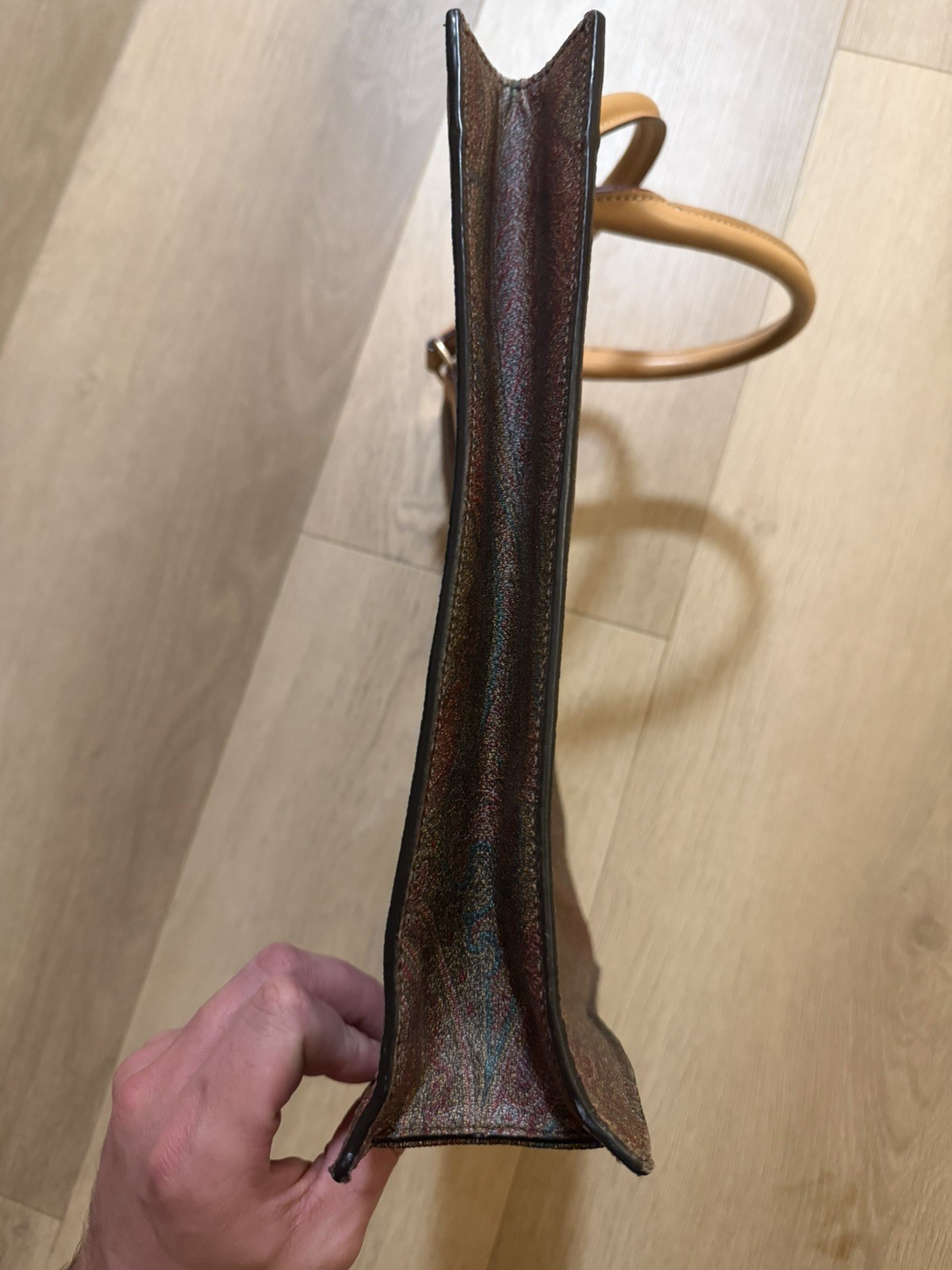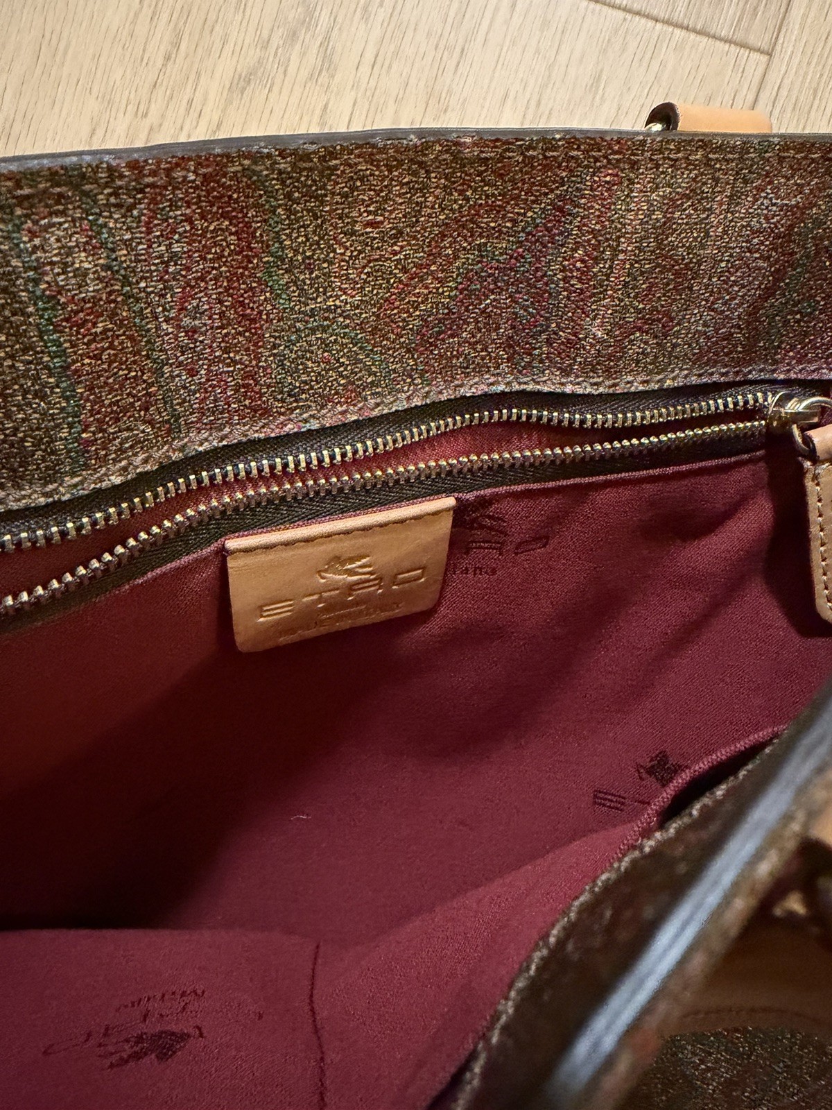 The Vintage Etro Women Bag is a stylish and unique tote handbag featuring a classic paisley pattern with the brand's iconic logo. This limited edition piece is perfect for travel, casual outings, or workwear, adding a touch of sophistication to any ensemble. Made from various exterior and lining materials in multicolor hues, this Etro handbag is designed for city dwellers who appreciate quality craftsmanship and timeless style. The Japanese-made bag is a must-have for fashion-forward women looking to make a statement with their accessories.