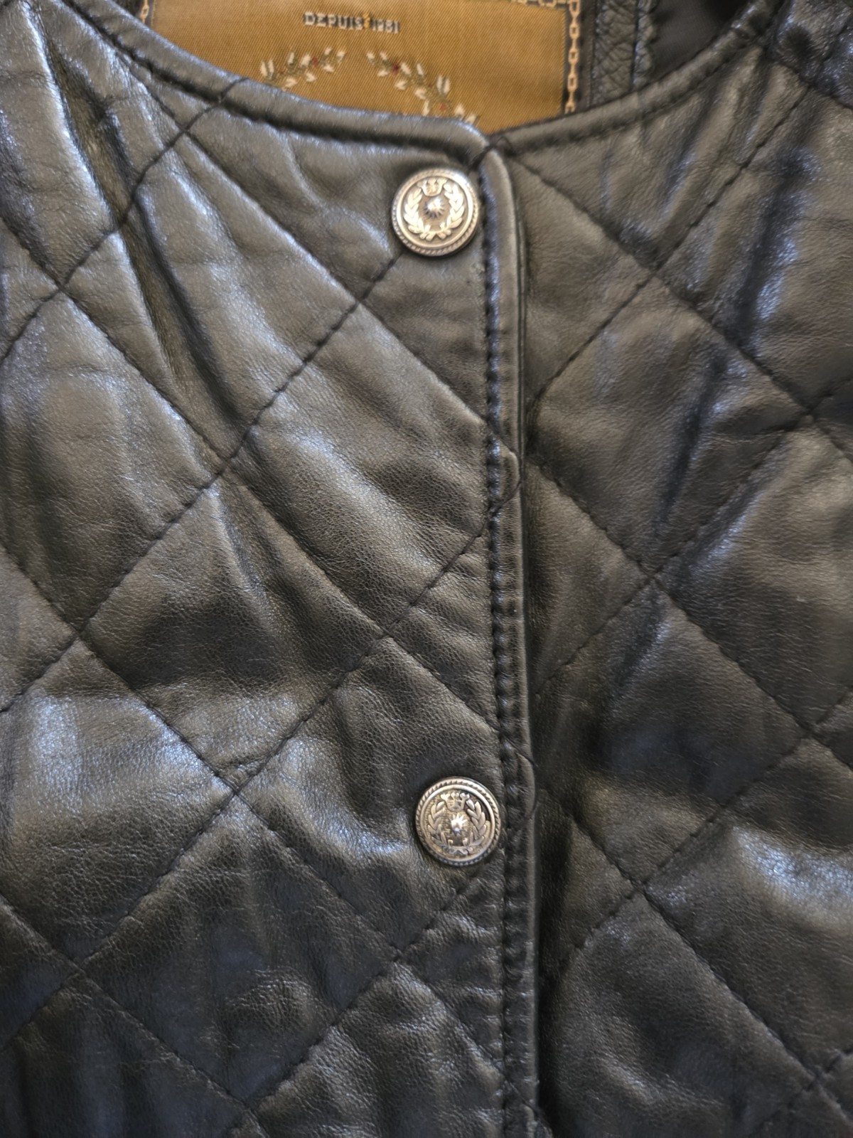 The Vintage Express AVENUE DE L' Opera Genuine Black Leather Jacket in Women's size Small is a stylish and versatile piece perfect for a variety of occasions. Made from genuine leather with a quilted pattern, this bomber-style jacket features a snap closure, shoulder pads, and pockets for added convenience. The black color and classic design make it timeless, while the lined interior with Thinsulate insulation ensures warmth and comfort during the colder seasons. Ideal for travel, casual wear, work, or business, this jacket exudes a vintage charm with a touch of sophistication.