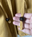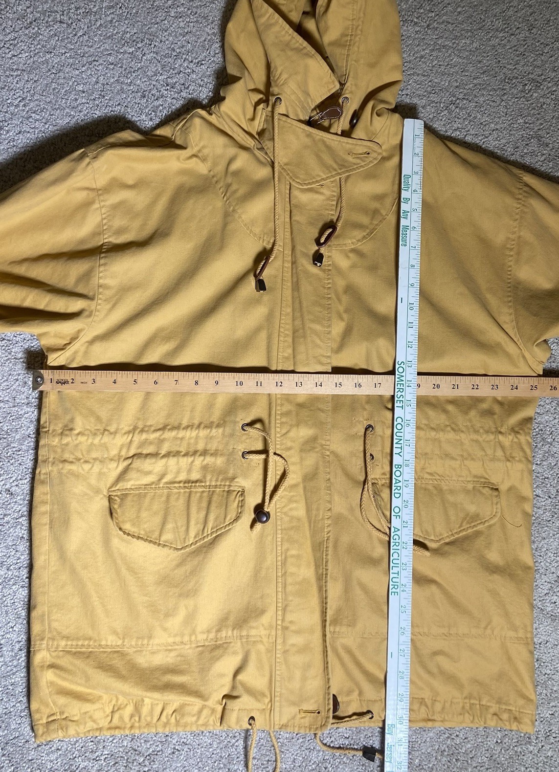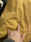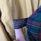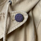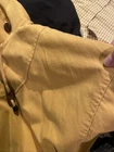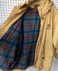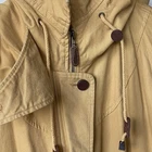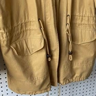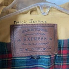 Brand: Express (Jeans by Express label; EXP embossed snaps with crown logo). Item: Women's anorak/parka jacket with full zip and snap storm flap. Condition: Moderate wear with faint marks. Small fray at throat-latch buttonhole; name written inside collar. Zipper, snaps, and drawcords function properly; lining clean. Tag size: Medium. Color: Tan/khaki. Materials: Shell 100% cotton; body lining 100% cotton tartan plaid; sleeve lining 100% polyester. Made in Korea; RN 55285. Features: High stand collar with throat-latch snaps; drawcord hood, waist, and hem with bead toggles; two front flap pockets; leather-trimmed cord ends; plaid interior. Label notes: Handwritten name inside collar reads "Marcie Jerome." Thanks for shopping with us!