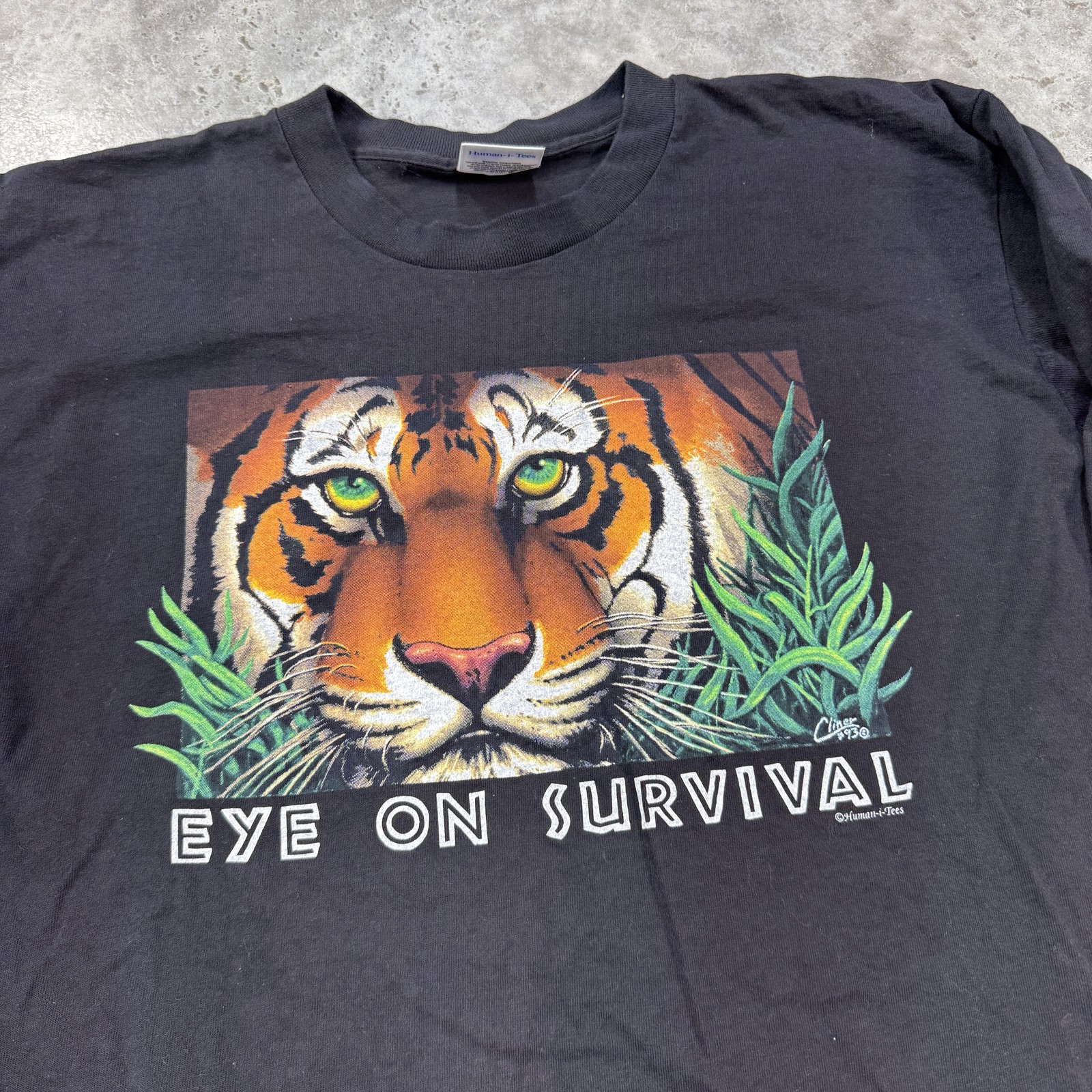 Vintage Eye On Survival Tiger Shirt Mens XL Black Long Sleeve Animal 90s USA Condition: Excellent vintage condition – gently worn, no visible flaws 100% preshrunk cotton for comfortable wear Eye-catching tiger graphic with 'Eye On Survival' text on front Artwork by Cliner, dated '93 Produced by Human-i-Tees – 20% of profits donated to environmental organizations Made in USA Tag size: XL (46-48) Flat lay measurements: Pit to pit approx. 23”, length from collar to hem approx. 32.5” Classic 90s environmental graphic tee, perfect for collectors or everyday style All images show actual item, smoke-free storage