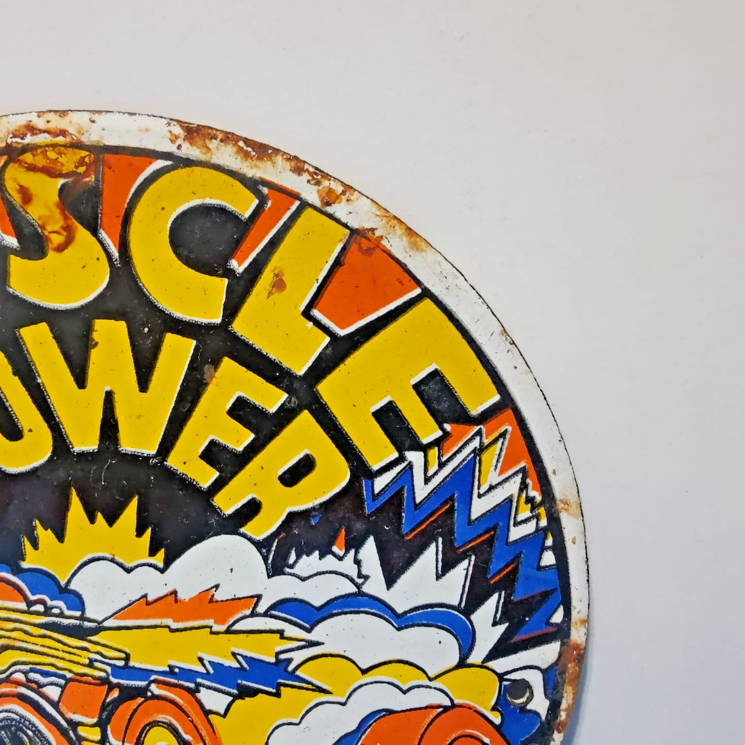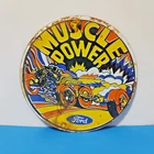 The Vintage FORD MUSCLE POWER Porcelain Enamel Sign measures 6 inches in size and is a collectible piece of advertising memorabilia. Made in the United States, this original sign features a multi-color enamel design with a theme centered around automobiles, particularly the Ford brand. It would make a unique and nostalgic addition to any collection of vintage automotive advertising items.