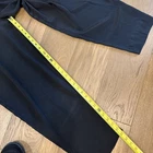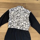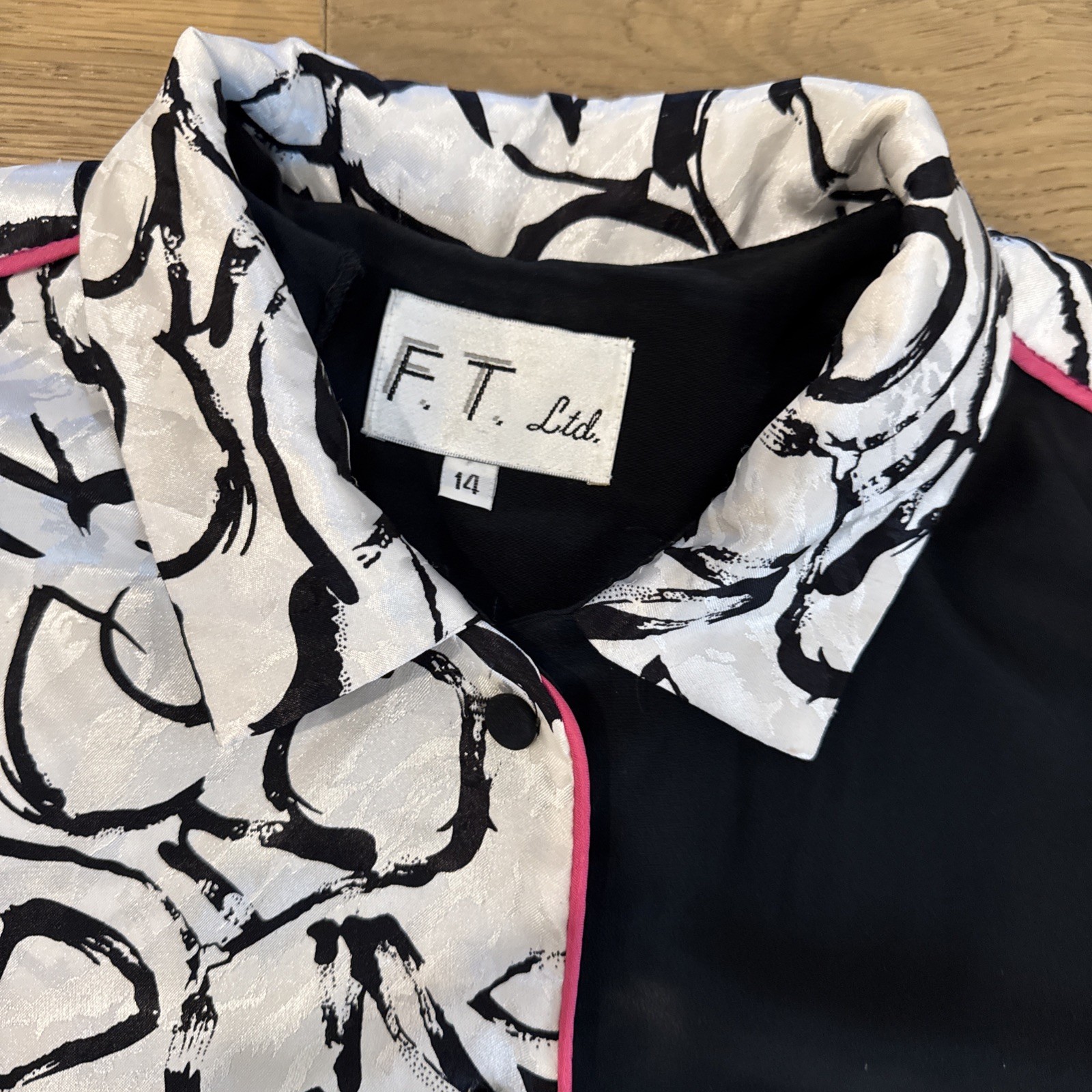 Bold vintage jumpsuit by F.T. Ltd featuring a striking black-and-white abstract print bodice contrasted with solid black sleeves and pants. The asymmetrical button-front design, graphic patterning, and hot pink piping accents give this piece a very 80s/early-90s art-forward look. Structured yet comfortable with a defined waist, functional pockets, and a zip fly closure. This is a standout piece that works for creative professionals, gallery events, or anyone who loves expressive vintage fashion. Condition: Very good vintage condition with no noted flaws. Clean, well cared for, and ready to wear. Details: • Brand: F.T. Ltd • Vintage women’s jumpsuit • Size tag: 14 • Color: Black / White with pink accent piping • Long sleeves • Abstract / graphic print bodice • Button-front detail • Zip fly • Functional pockets Measurements (laid flat, approximate): • Pit to pit: 22.5” • Waist: 16.5” • Hips: 22.5” • Shoulder to waist: 18.5” • Shoulder to hem: 59.5” • Inseam: 29” • Rise: 14”