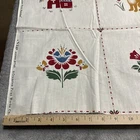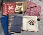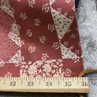 This vintage fabric is a charming addition to any collection. It features a delightful floral and striped pattern in multicolor shades, perfect for all occasions. Made of light cotton material, it's suitable for quilting projects with a country style theme. The fabric is from the 1980s and comes in various sizes. It's an original piece and perfect for those who appreciate the beauty of vintage textiles. Add this to your linens and textiles collection today! Gray/Blue fabric is 39 inches x 44 inches with a section of 15 inches x 24 inches cut out. Stripe with silver stripe fabric is 33 inches x 44 inches. Bright Blue fabric is 22.5 inches x 44 inches. Square patterned fabric is 22 inches x 22 inches. Tan fabric is in two strips measuring 31 inches x 10 inches each. Pink star fabric is 36 inches x 44 inches. The country squares are 9 inches x 9 inches for a total of 9 squares. The floral fabric is 86 inches x 20 inches with a 11 inch x 9.5 inch piece cut out and a 32 inch x 23 inch section making it an L shape piece of fabric.