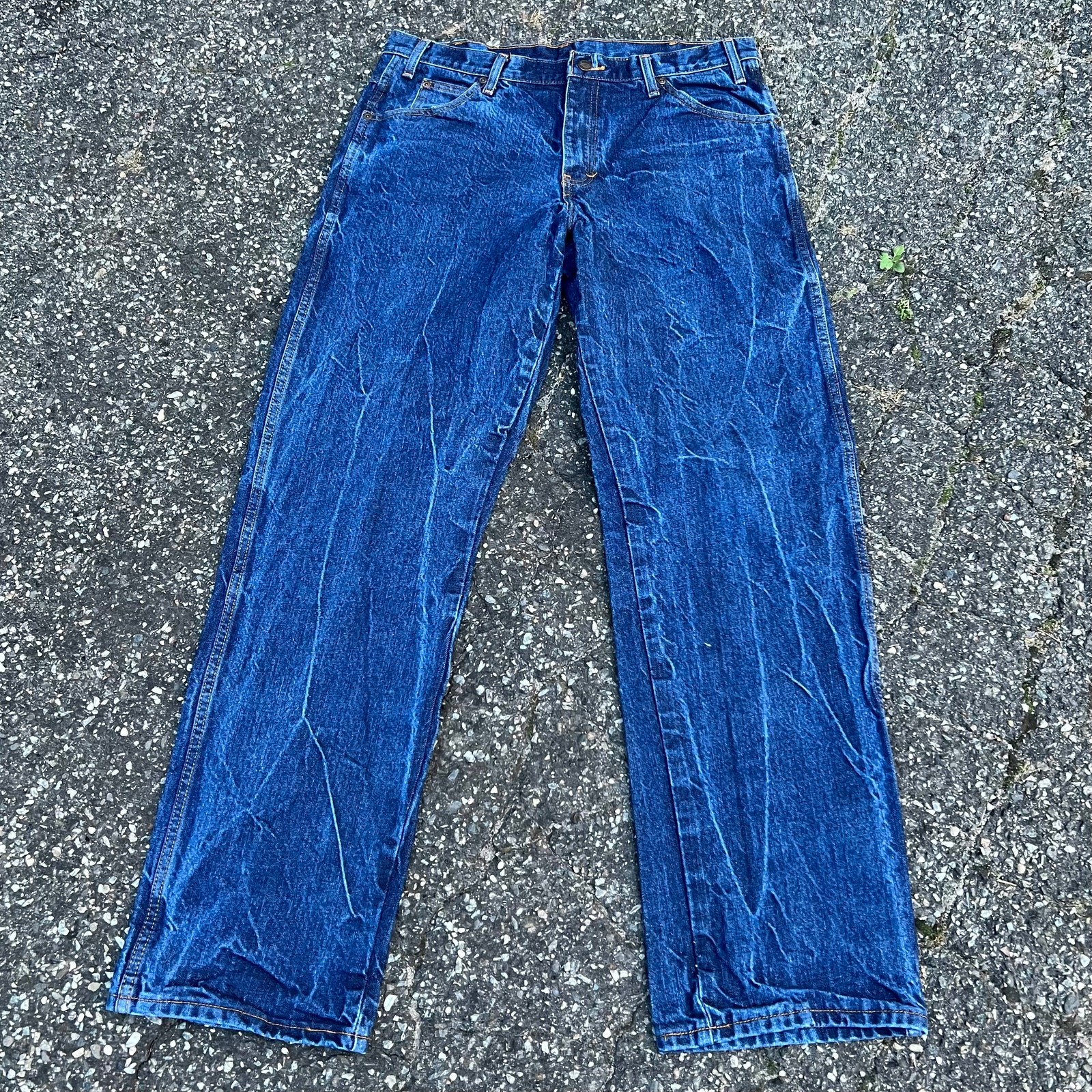 Vintage faded blue dickies denim jeans work wear carpenter pants. Really cool fading on these. Awesome wash. Measure 34x34 and a 9 leg opening. Please check measurements before purchasing. I do my best to show any flaws in pictures. Quick shipping! Bundles encouraged! @ants_haul on Instagram.