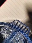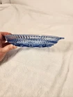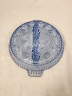 Enhance your serving collection with the classic elegance of the Federal Glass Windsor blue glass divided relish candy dish. This round piece, measuring 8.5 inches in length and 1 inch in depth, is a testament to timeless design, featuring an all-over pattern that catches the eye. Its two compartments allow for a neat presentation of your sweets or condiments, making it a practical addition to any table setting. Crafted in the United States during the 1970s, this original, pressed glass dish reflects the quality and style of the era. With a glossy finish and a color that's as vibrant today as it was back then, this dish is a beautiful piece for both use and display. Please note, to maintain its vintage beauty, hand washing is recommended for this item. please note the last pic for condition. tiny chip on handle.