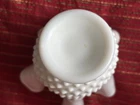 This vintage Fenton milk glass vase features a beautiful hobnail pattern with ruffled asymmetrical edges, standing at 7" high. Handmade and originating from the mid-century modern era, this original piece exudes charm and nostalgia. The white milk glass material adds a touch of elegance to any space, making it a unique and eye-catching addition to any collection of decorative pottery and glassware. Very good previously owned condition. Label a little worn but still readable.