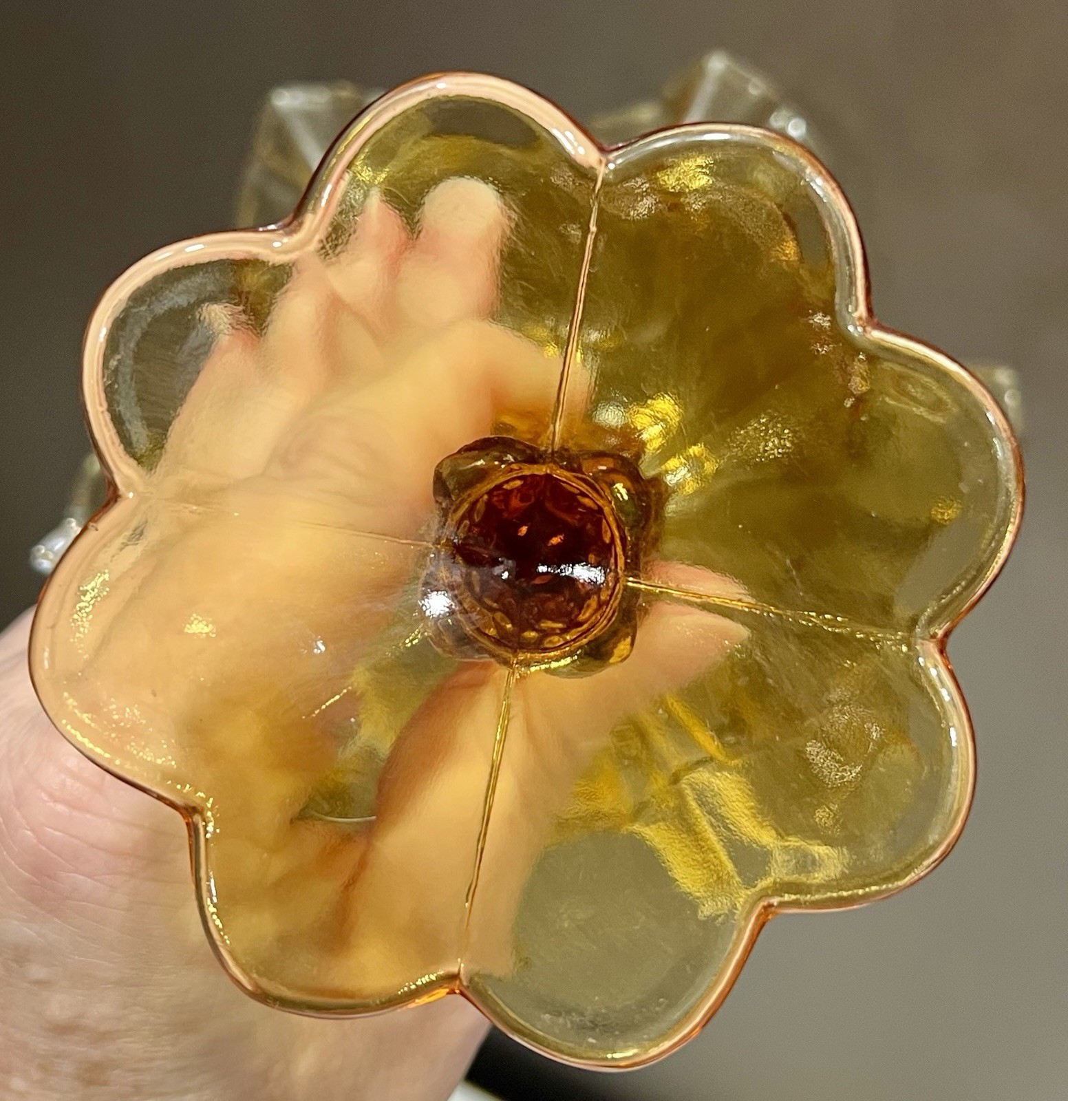 This vintage Fenton Art Glass Amber Gold Cabbage Rose Ruffled Rim Compote Candy Dish is a beautiful and decorative piece that adds a touch of elegance to any space. Hand-blown in the 1970s, this pedestal candy dish features a floral pattern with a glossy finish, perfect for showcasing sweets or as a standalone decorative item. Made in the United States by the renowned Fenton brand, this original piece exudes a timeless charm with its intricate design and vibrant gold color. Ideal for collectors or those looking to add a touch of vintage flair to their home, this candy dish is a true treasure.