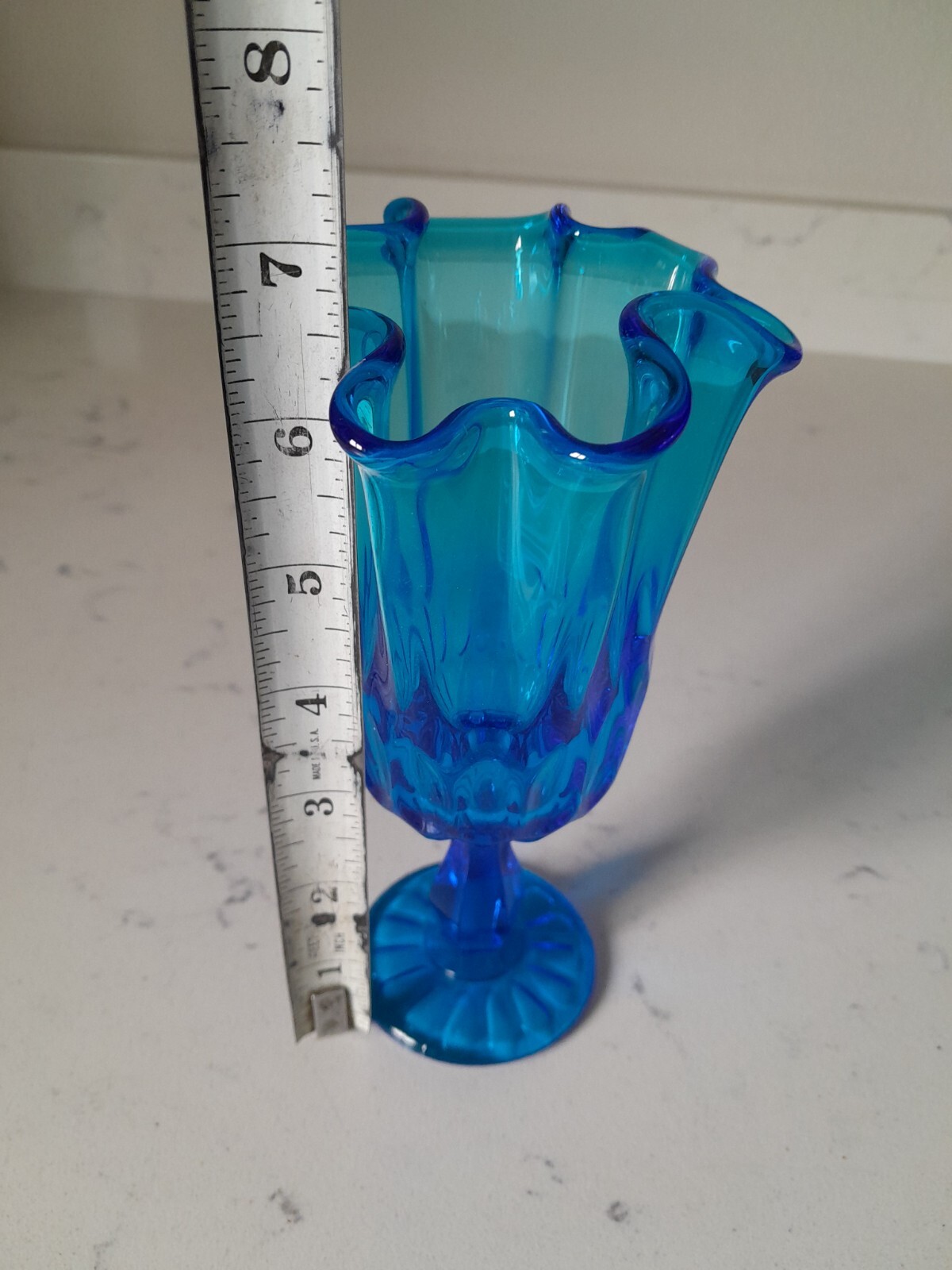 This vintage Fenton Swung vase in Colonial Blue is a beautiful addition to any mid-century modern decor. The hand-blown glass production technique used to create this piece results in a unique thumbprint pattern that adds character to the vase. Measuring 6.5 inches in height, this vase is the perfect size for displaying fresh flowers or as a standalone decorative item. The pedestal base adds an elegant touch to the overall design, and the original Fenton product line ensures the quality and authenticity of this piece. Whether you're a collector of vintage glassware or simply looking for a unique decor item, this Fenton Swung vase is sure to impress. Pristine