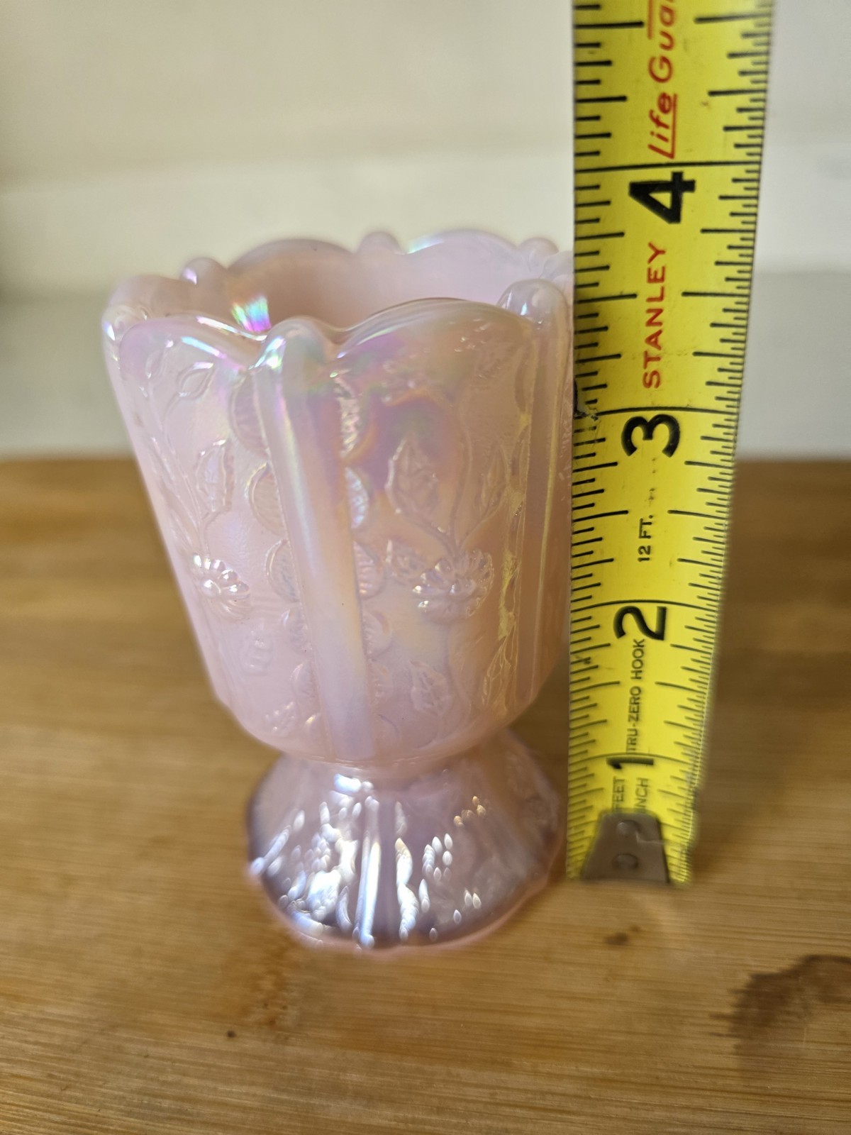 The Vintage Fenton Light Pink Paneled Daisy Toothpick Holder is a charming collectible piece made of opalescent pearl glass in the United States. Standing at 3 5/8 inches tall and 2 1/4 inches wide, this original toothpick holder features a beautiful paneled daisy pattern, adding a touch of elegance to any kitchen or dining room. This rare find from the renowned Fenton brand is a unique and delightful addition to any vintage collection. Excellent condition