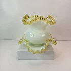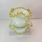 This vintage Fenton melon cased white milk glass vase tray features a ruffled top design in a small size. Handmade in the United States using a hand-blown glassmaking technique, this glossy yellow vase is a beautiful and unique decorative collectible piece. Perfect for collectors or those looking to add a touch of vintage charm to their home, this Fenton vase is a true artisanal treasure. Excellent used condition. No chips or cracks.