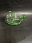 No chips or cracks. Bottom has soem scratches consistent with use. This vintage Fenton milk glass bowl with a double crimped gold rim is a beautiful example of Art Deco style glassware from North America, specifically manufactured between 1943-1945. The round bowl features a glossy green finish and a decorative bird pattern, typical of Fenton's production style of Art Glass. With a diameter of 8 inches and a height of 2.5 inches, this original vintage piece is perfect for all occasions and should be hand washed for care. Made in the United States, this bowl is a unique and decorative addition to any collection of early 20th-century glassware.