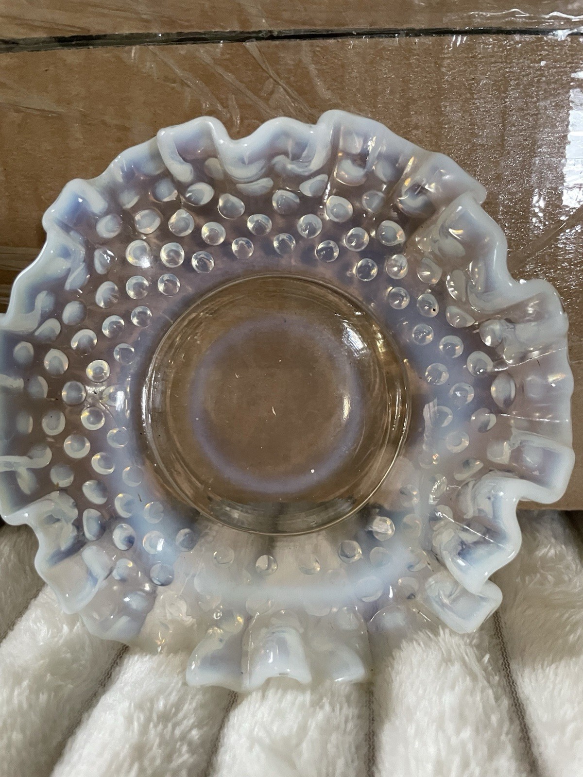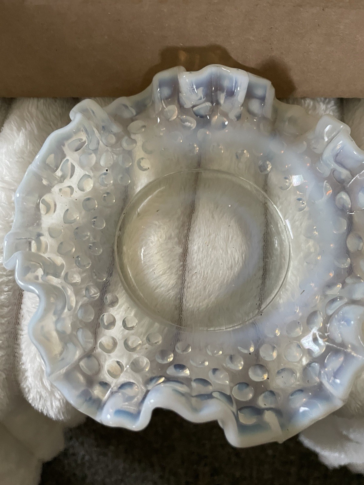The product is a vintage ashtray made by Fenton between 1941 and 1946. It features a unique moonstone opalescent hobnail design with scalloped edges, adding a touch of elegance to any home decor. This collectible piece of decorative pottery and glassware is a rare find for collectors of vintage Fenton pieces, showcasing the craftsmanship and charm of the mid-20th century.