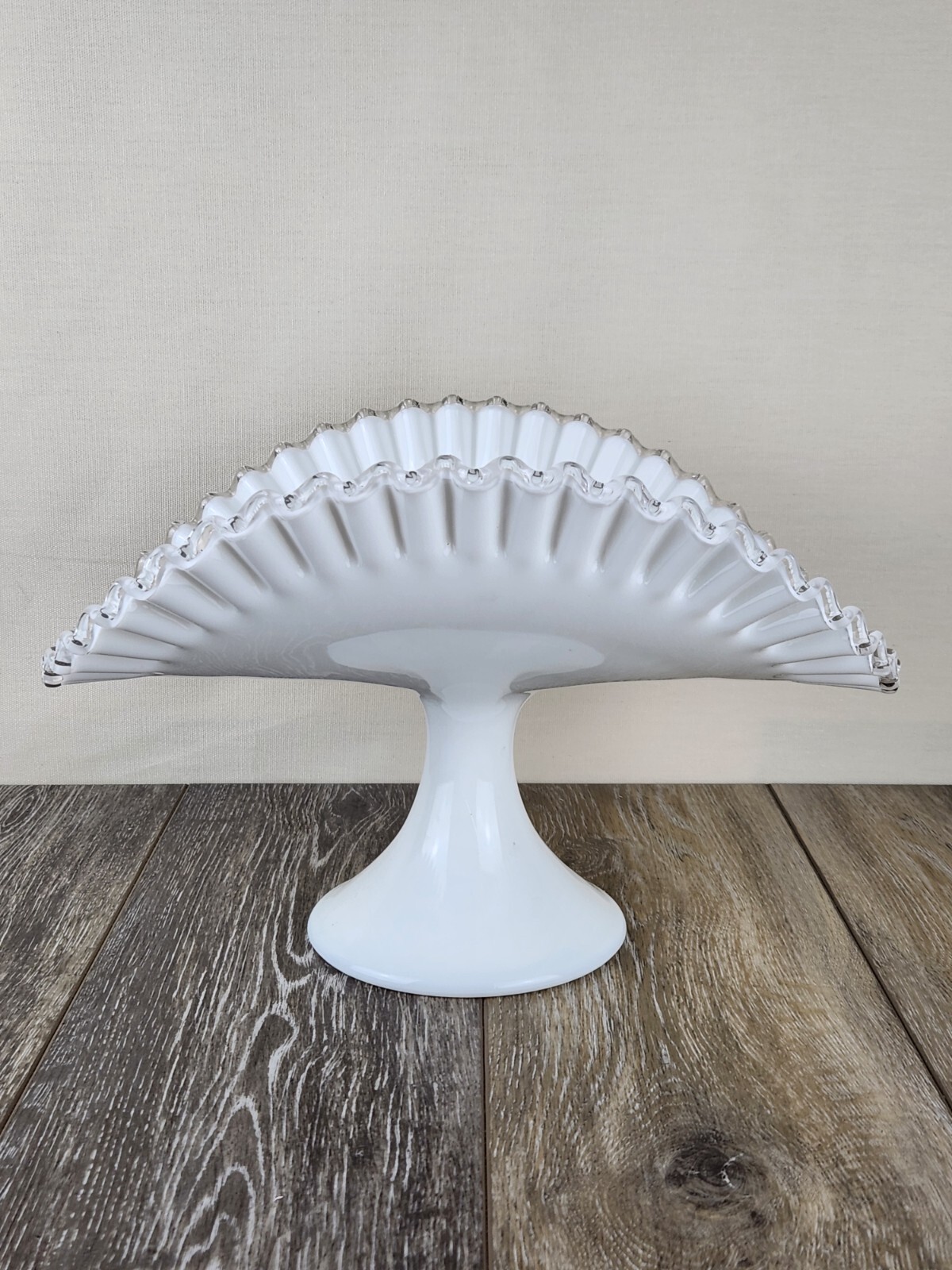 Whether you're styling a vintage kitchen or gifting a special piece to a collector, this Fenton Silver Crest milk glass fruit bowl is the perfect pick. The pure white body contrasts beautifully with the clear glass crimped edge, adding a refined touch to any display. Perfect for holding fruit, florals, bread, or seasonal decor, this pedestal serving dish also works wonderfully as a wedding centerpiece or a shabby chic accent. A charming piece of vintage glassware that’s both practical and beautiful. *Excellent condition!