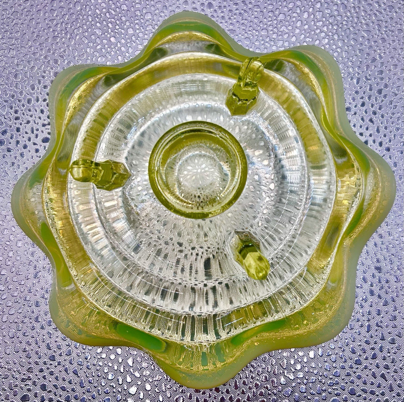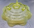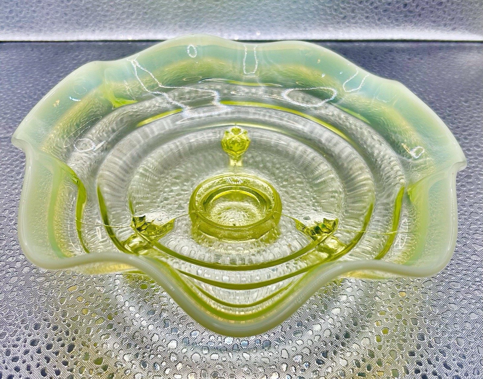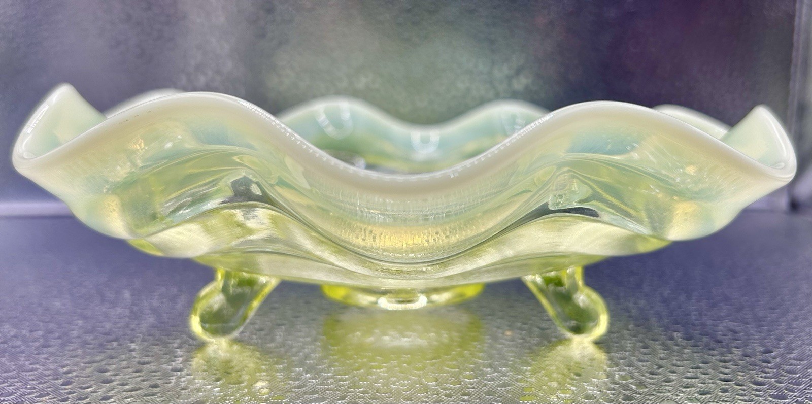 Fabulous Fenton Vaseline Topaz Ringed Footed Ruffled Bowl ~ Gorgeous Three Footed Dish In The Opalescent Top Edging On Topaz Color ~ Ringed Design ~ Made by Fenton Glass Company ~ Approximately 7” Across & 2 & 1/2” High ~ See Photos