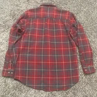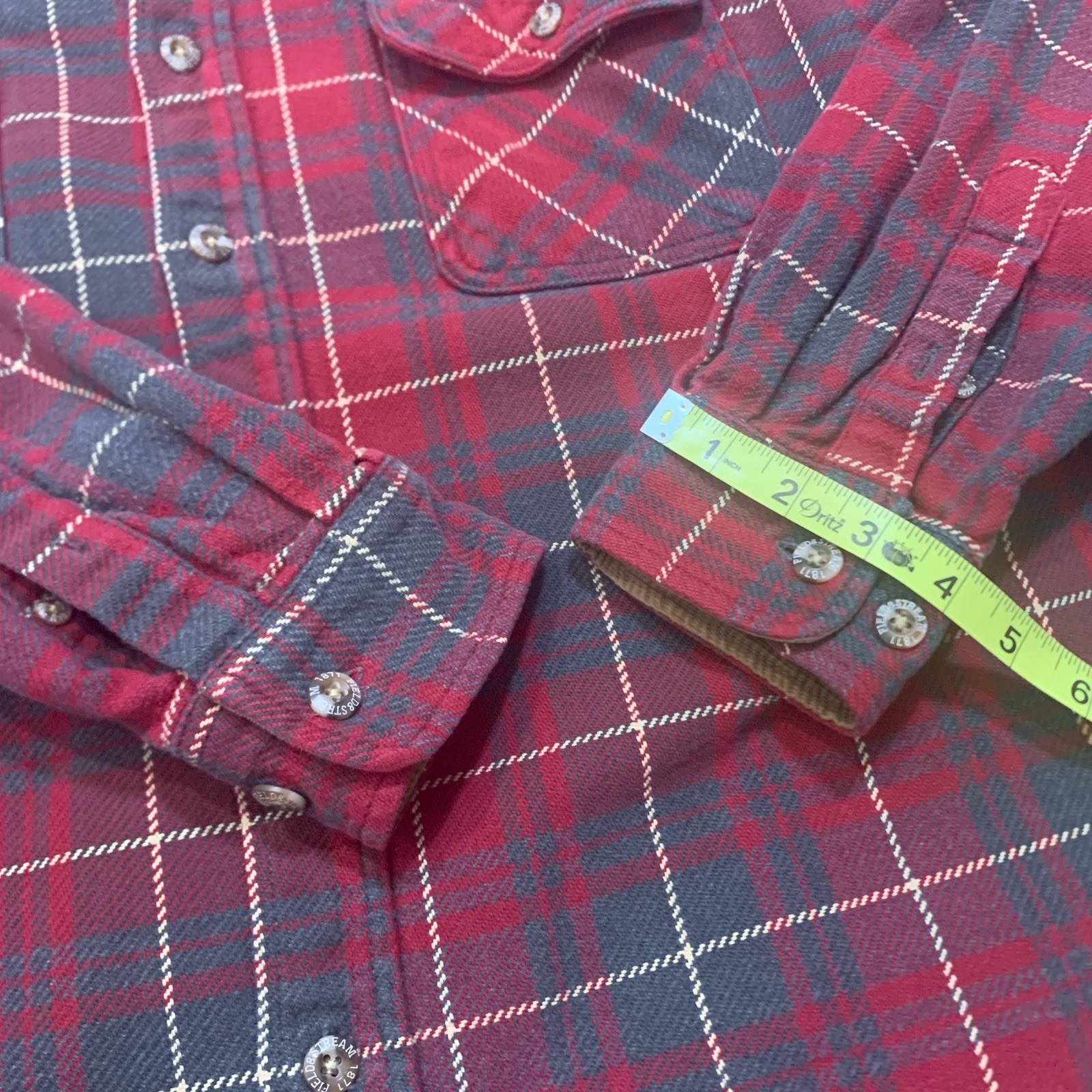 The Vintage Field & Stream Heavy Flannel Shirt is a classic red plaid button-up designed for men in size Large Tall. Made from heavyweight cotton flannel, this shirt is perfect for outdoor activities in the winter and fall seasons. With a collared neckline, long sleeves, and a spread collar style, it offers a comfortable regular fit for casual occasions. The shirt's vintage appeal adds a touch of retro charm, while the addition of pockets provides functionality and style. See photos for details, condition and measurements. Nice shirt!