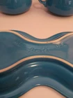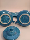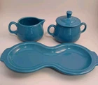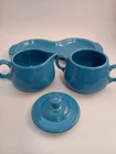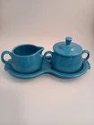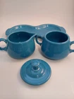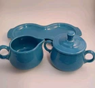 Add a touch of vintage charm to your tea party with this Fiestaware 4 Piece Cream and Sugar Set. The set includes a beautiful peacock blue ceramic creamer and sugar bowl, both adorned with an art deco style and glossy finish. The set also comes with a matching tray, making it perfect for serving and displaying. Crafted in the United States with pottery production techniques, this original Fiestaware set is a must-have for any collector. The set features hand handles and a lid, making it both functional and decorative. Painted with a solid pattern and backstamp, this set is a unique addition to any kitchen or dining room.