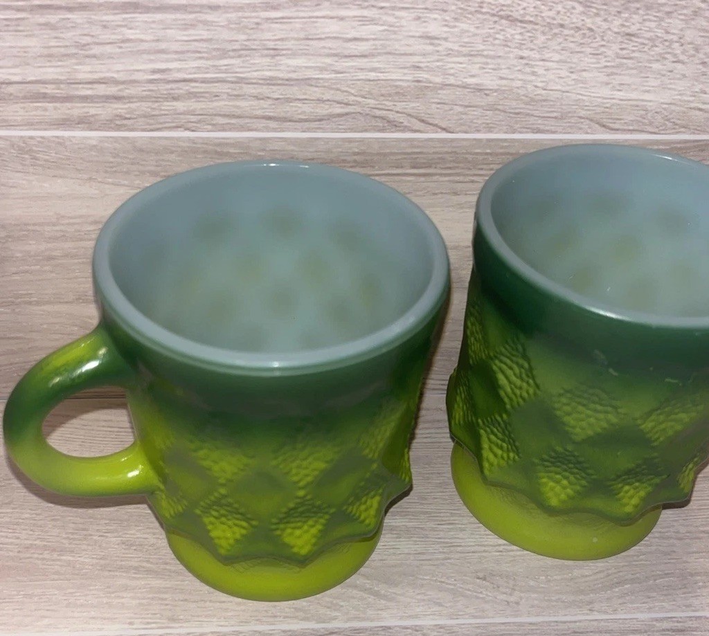 Item Height: 3.8 in Theme: American Time Period Manufactured: 1960-1969 Original/Licensed Reproduction: Original Production Style: Milk Glass Type: Coffee Mug Handmade: No Product Line: Anchor Hocking Number of Items in Set: Two-Piece Model: Kimberly Diamond Pattern Pattern: Kimberly Diamond Department: Unisex Adults Brand: Fire King Item Diameter: 3 in Color: Green Backstamp: Impressed Material: Glass Features: Decorated, Decorative, With Handle Production Technique: Studio Crafted Occasion: All Occasions Year Manufactured: 1970 Shape: Round Care Instructions: Hand Wash Only Style: Retro Vintage: Yes Country of Origin: United States Finish: Glossy